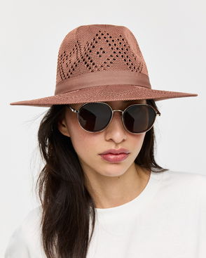 Brown fedora style hat with stitched leather trim.