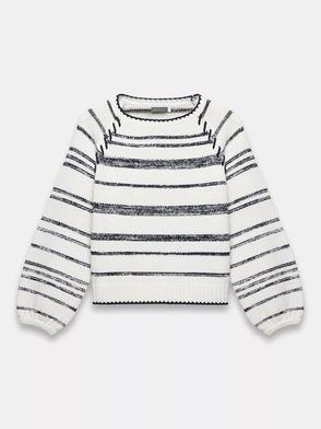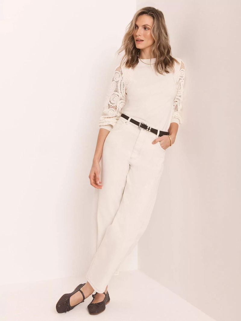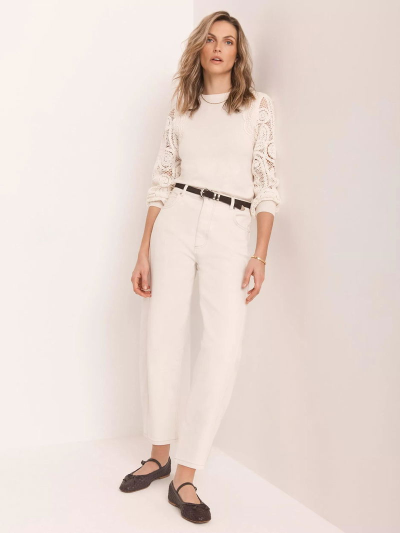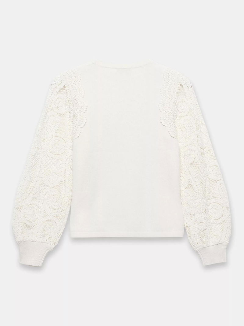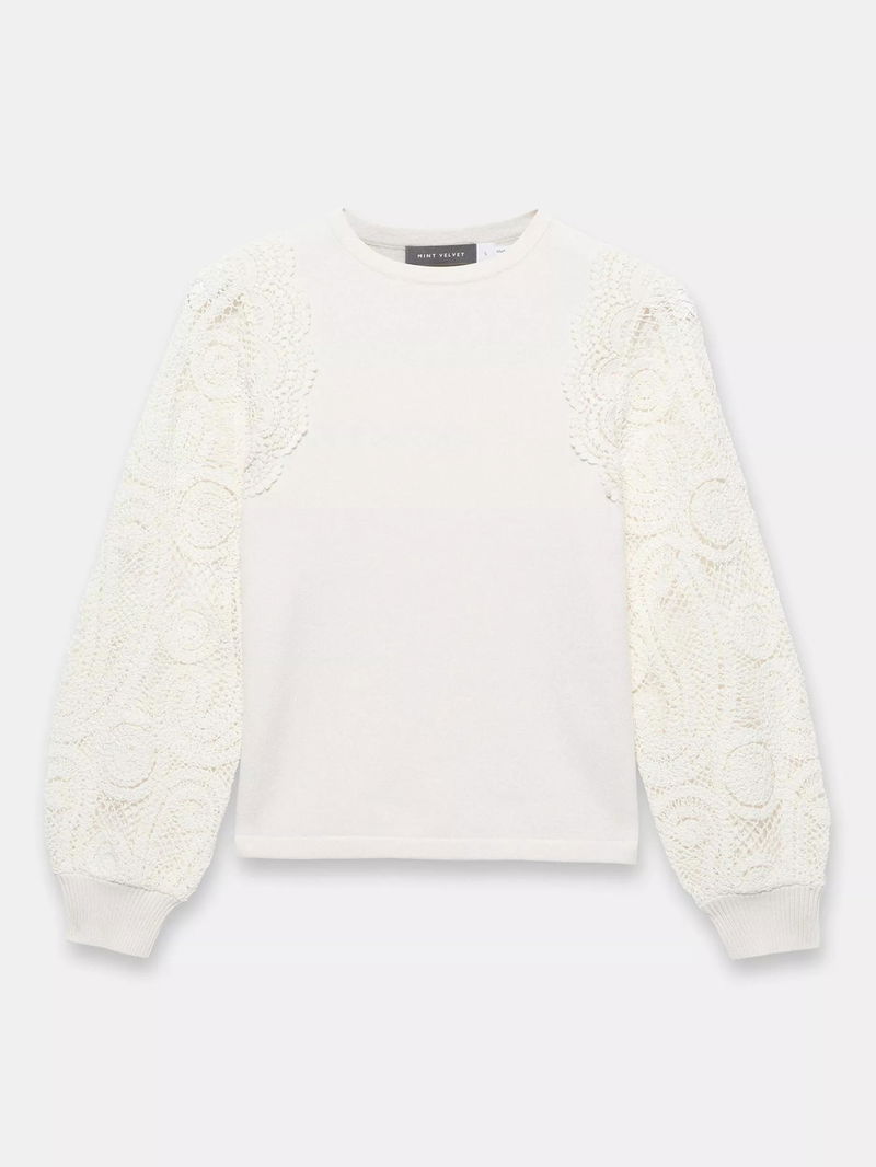 Crew Neck Crochet Sleeve Jumper, White Ivory