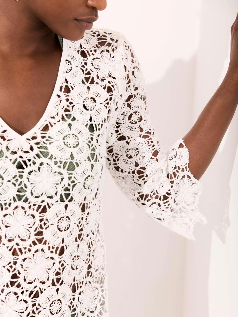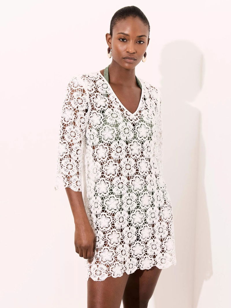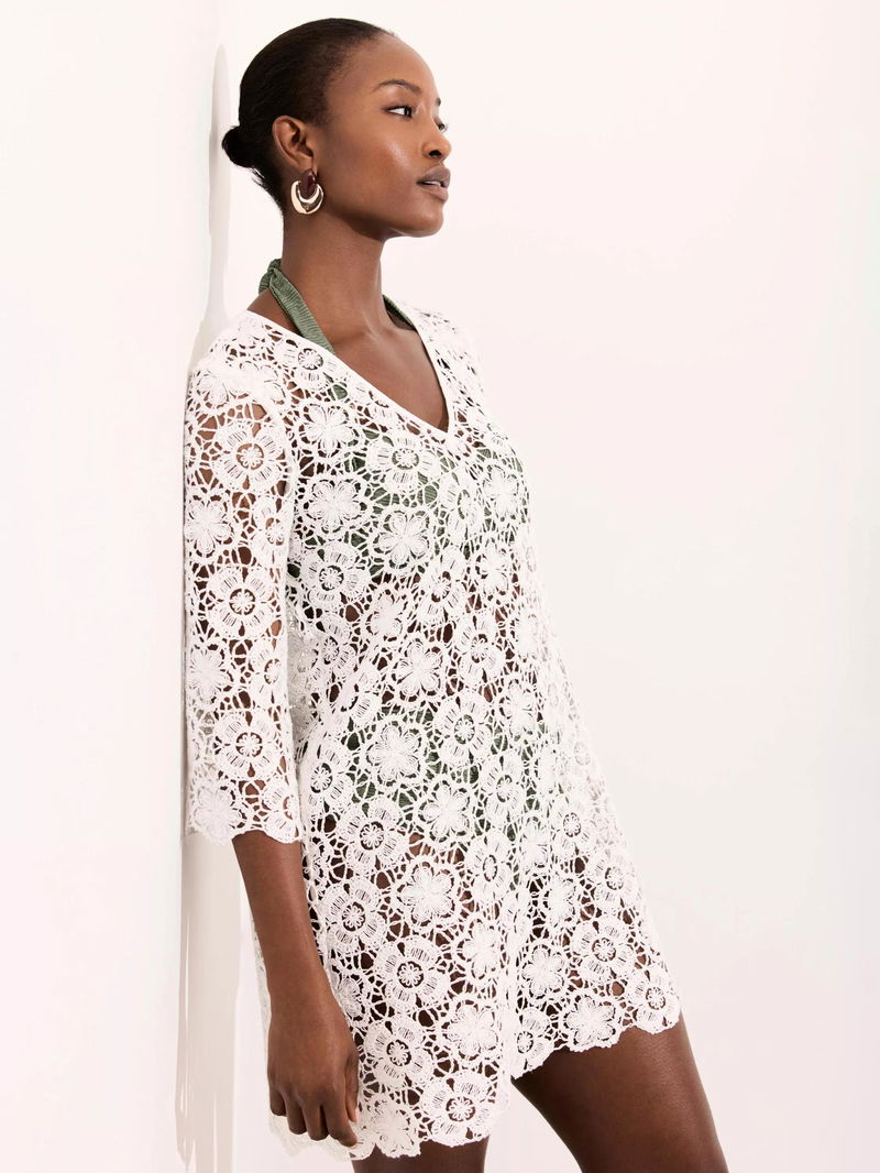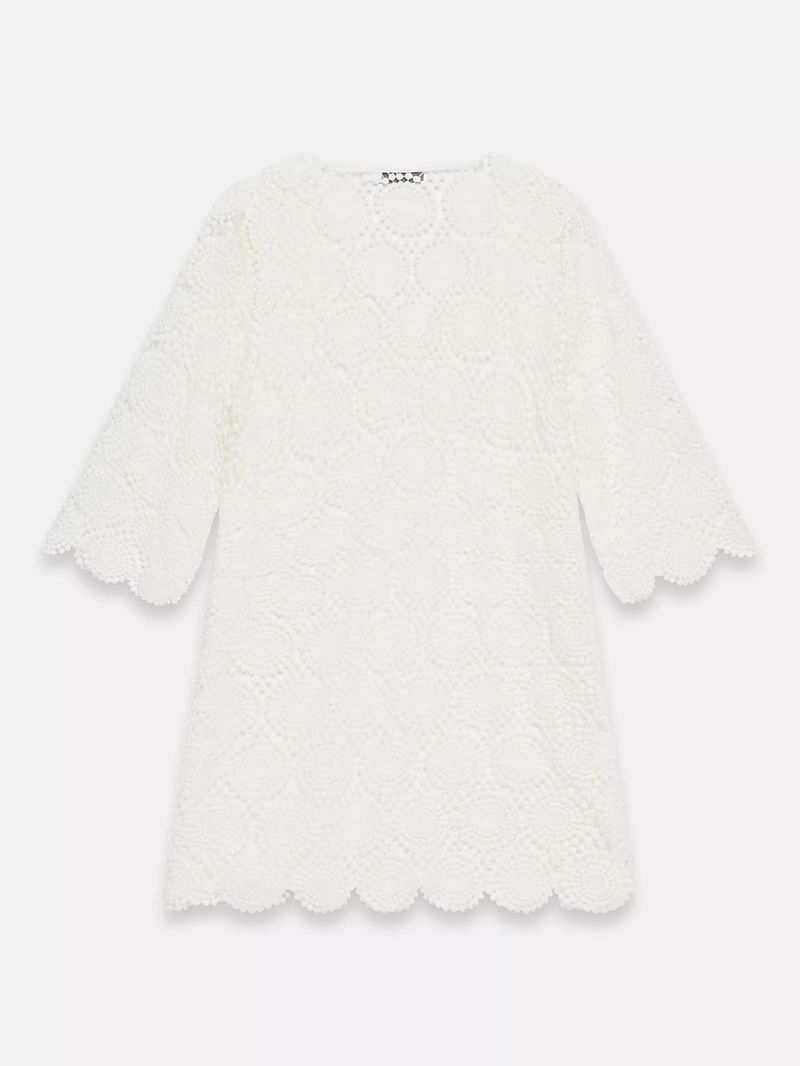A crochet dress in a mini silhouette featuring a V-neckline, long sleeves and scallop trim.