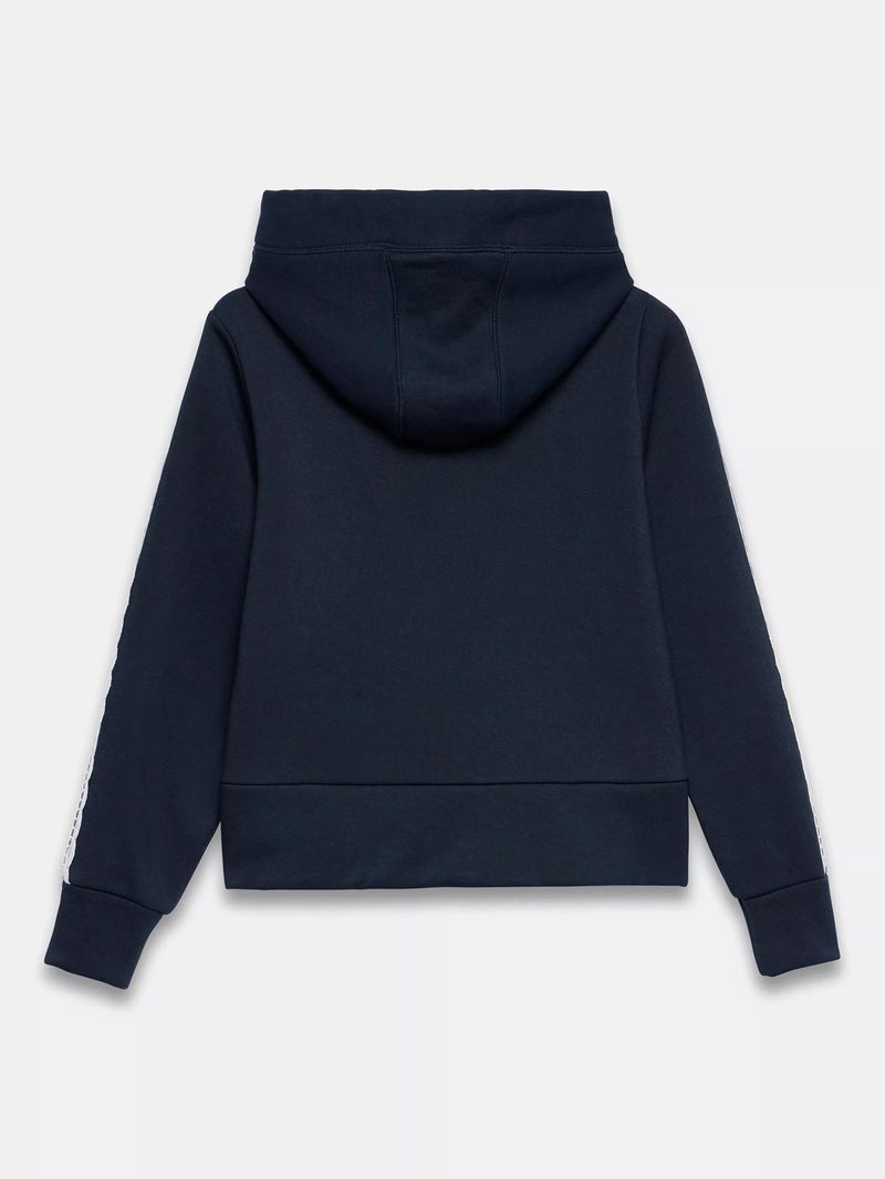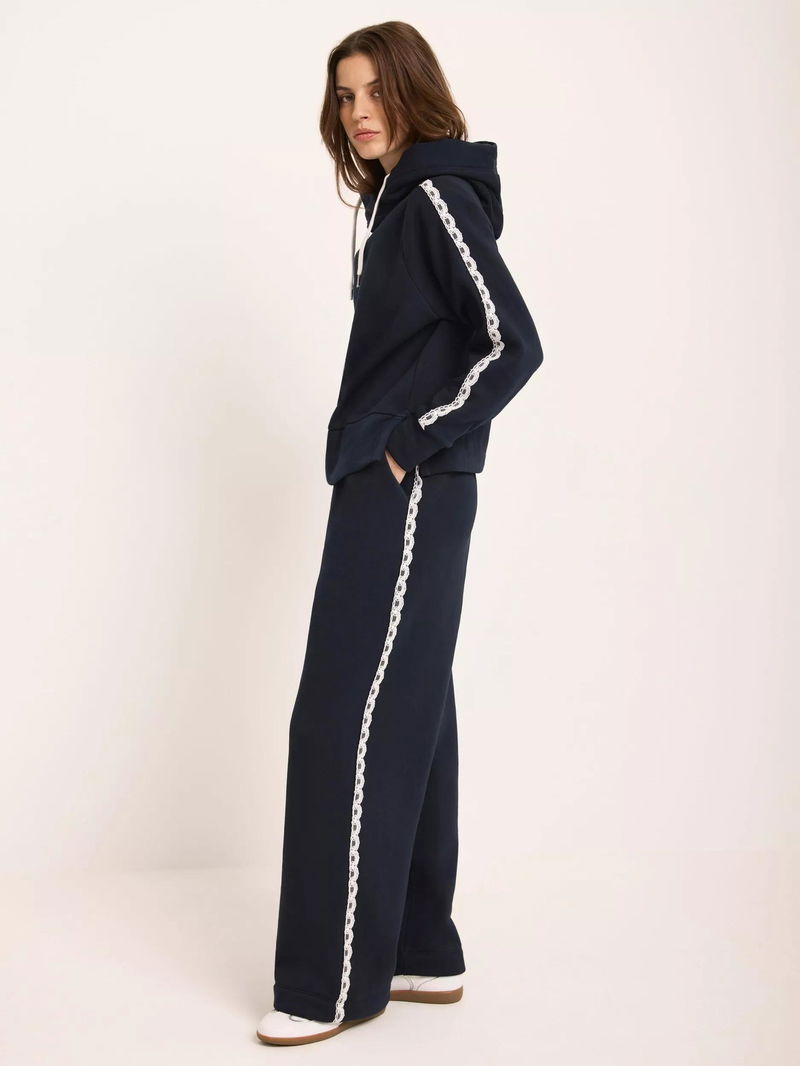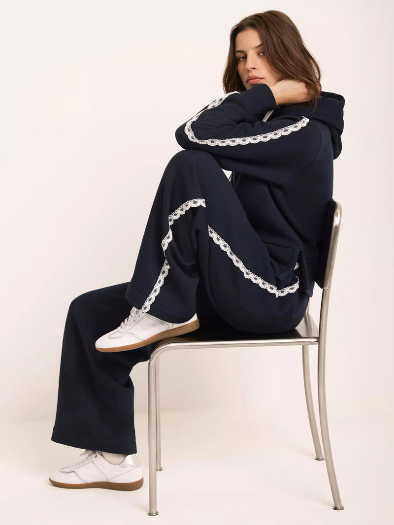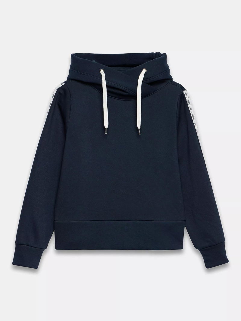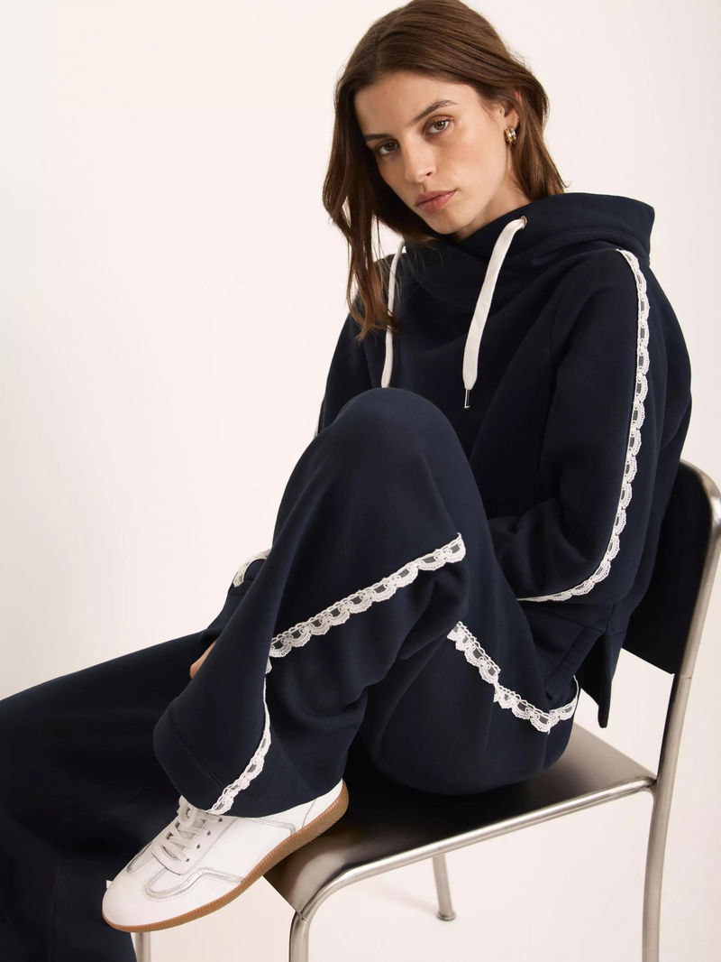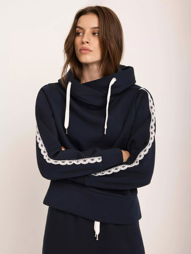 A cotton-rich sweatshirt featuring a cross-front hooded neckline, long sleeves, and crochet trim with a drawstring fastening through the front.