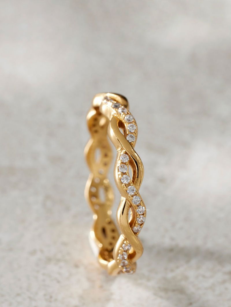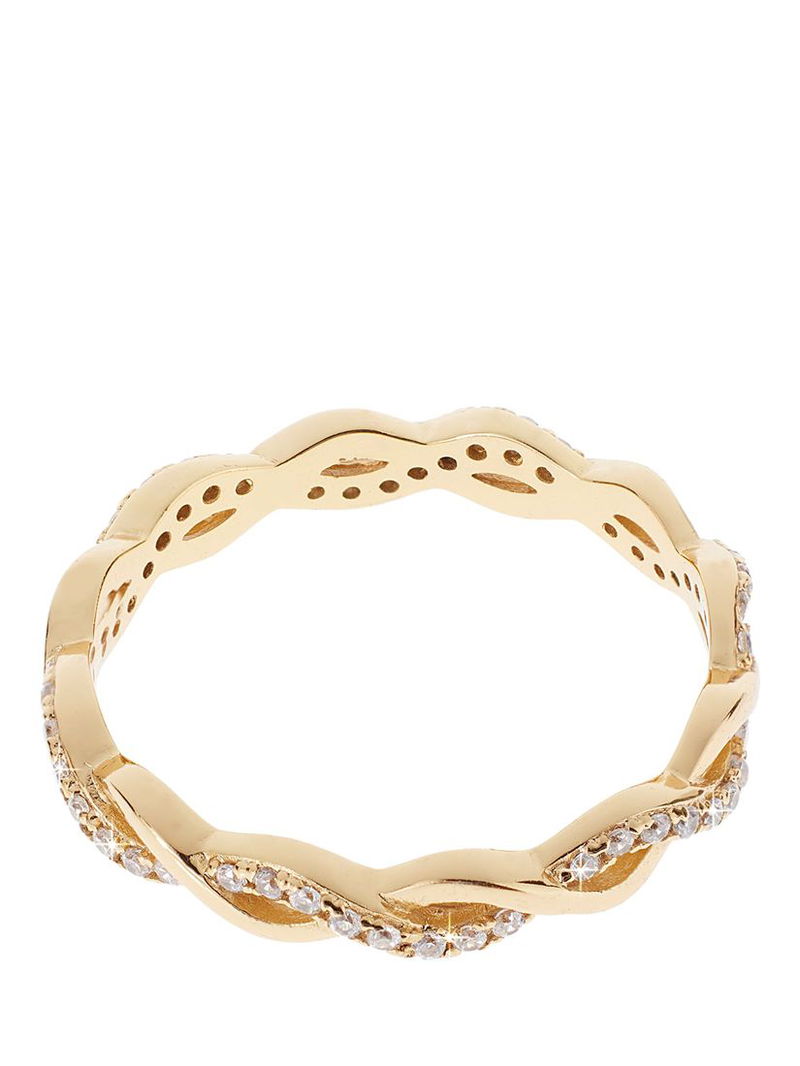 A row of pave set cubic zirconia gemstones is artfully twisted with polished plated metal to create this eye-catching ring.