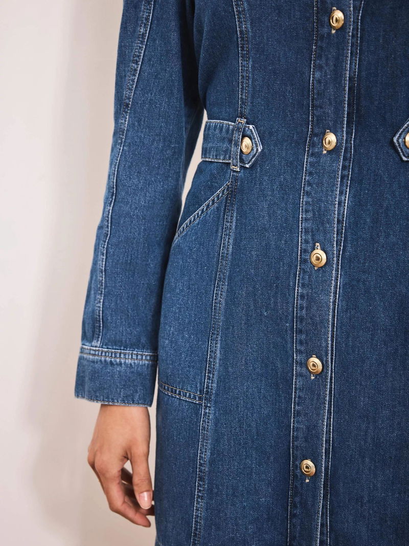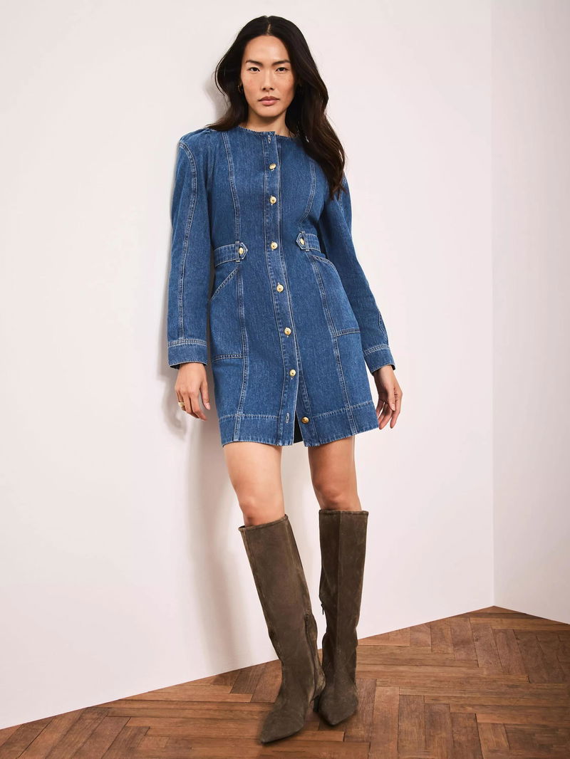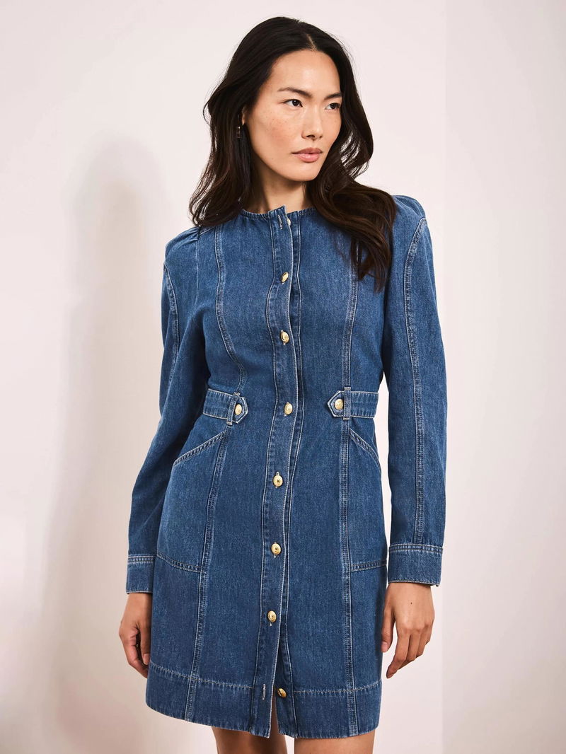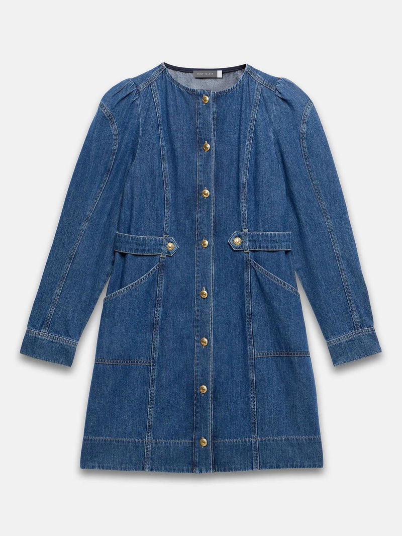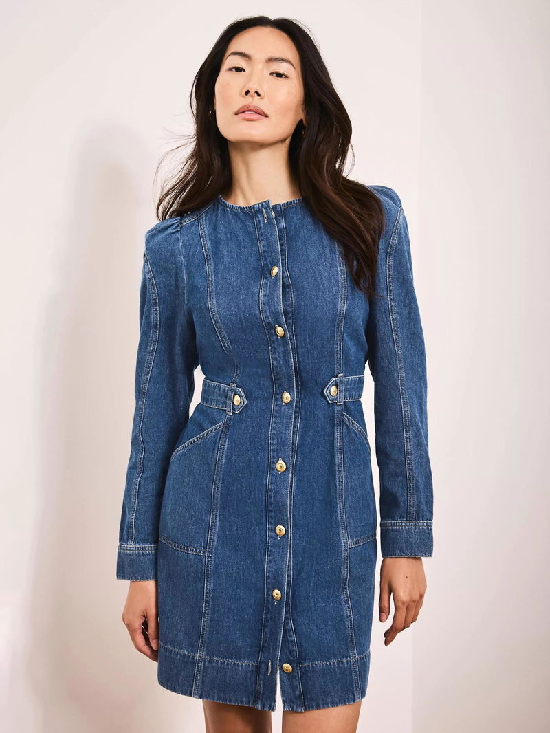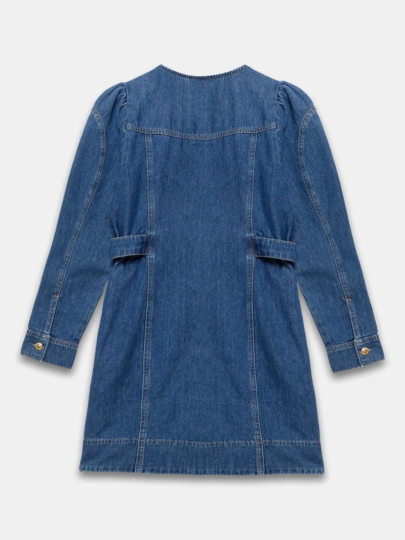 A denim dress in a mini silhouette featuring a crew neckline, puff shoulders, long sleeves, button tab waistband, side pockets with a button fastening through the front.