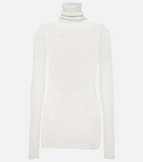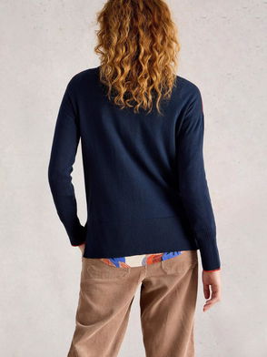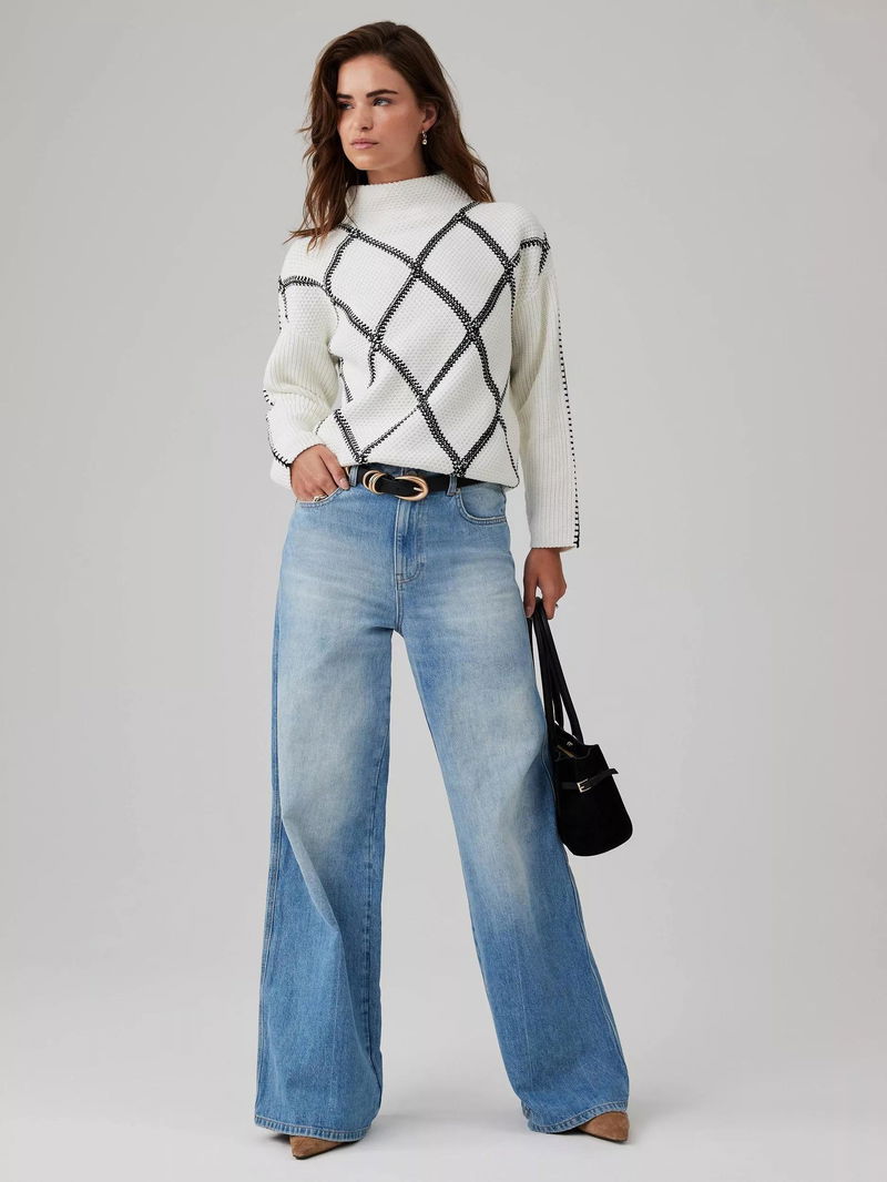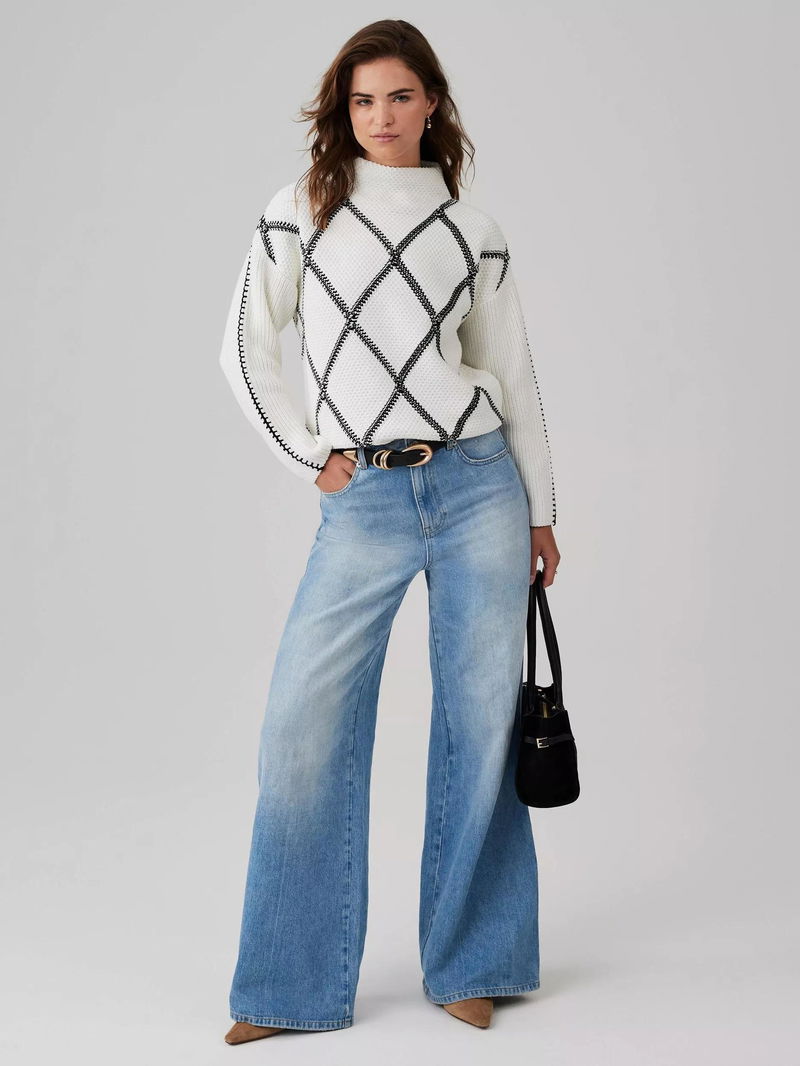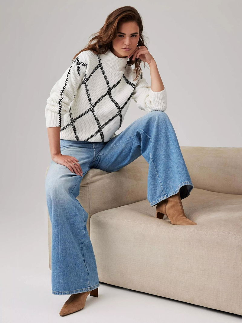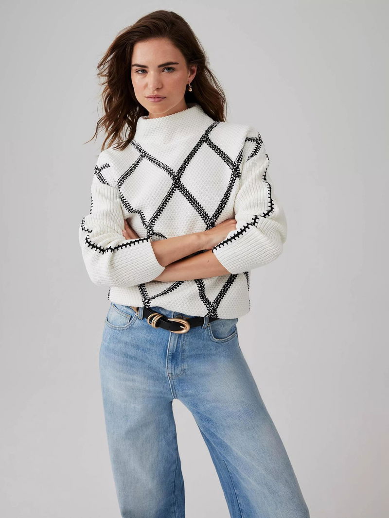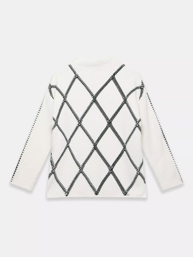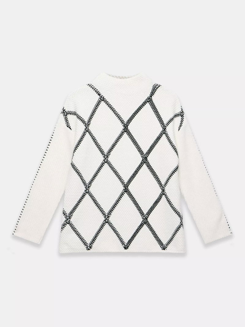 A cotton-rich jumper with a high neckline, long sleeves and diamond stitch design.