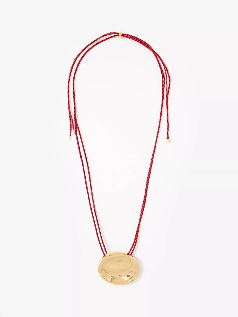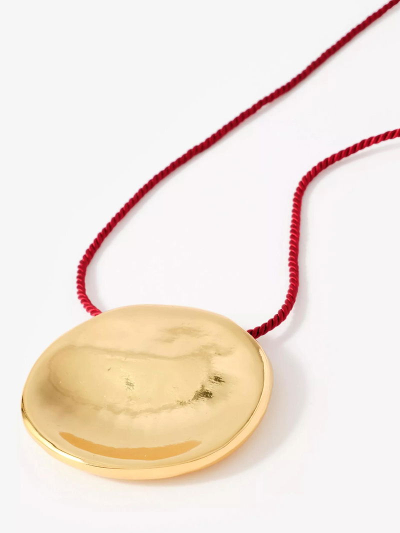 A polished disc suspended from a coloured rope and secured with a slider fastening.