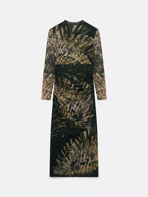 An animal print dress in a midi silhouette featuring a crew neckline, drape detail and long sleeves.