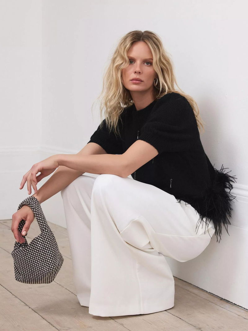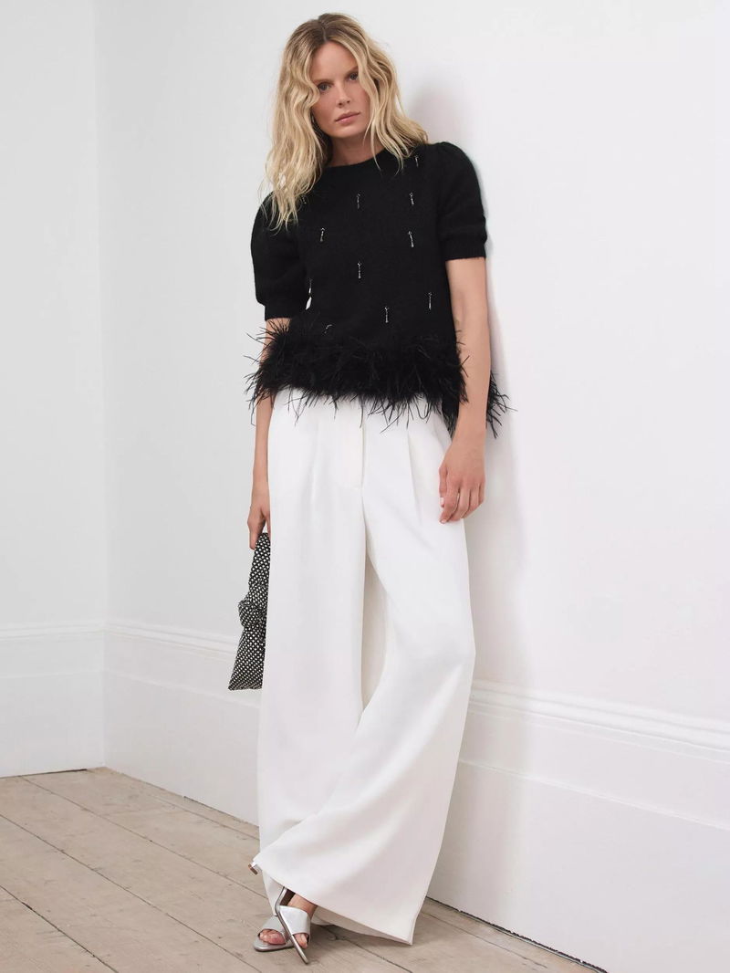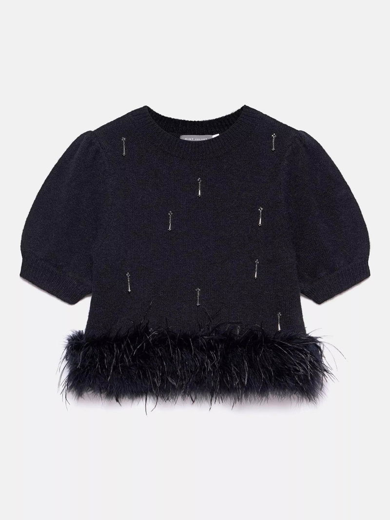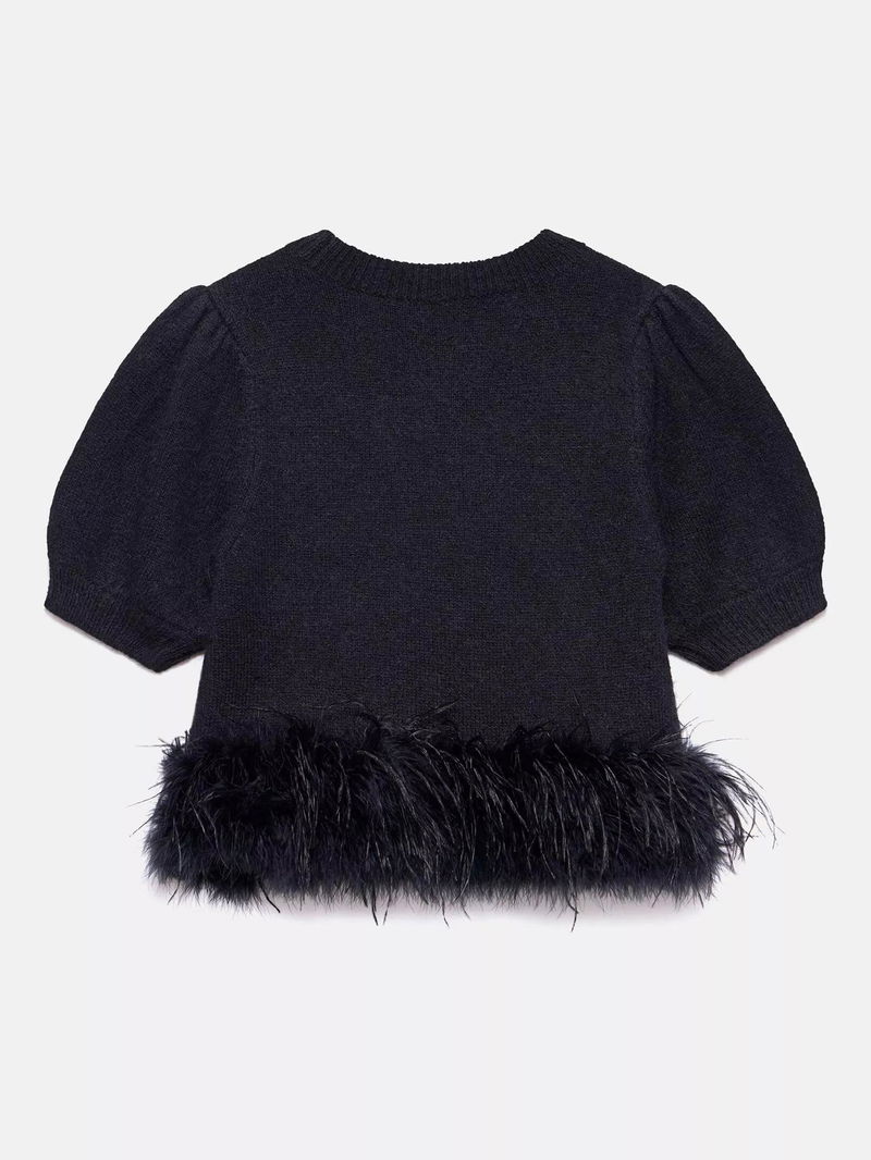 Black top in a cropped silhouette featuring a crew neckline, short puff sleeves, embellishment and a feather trim waistband.