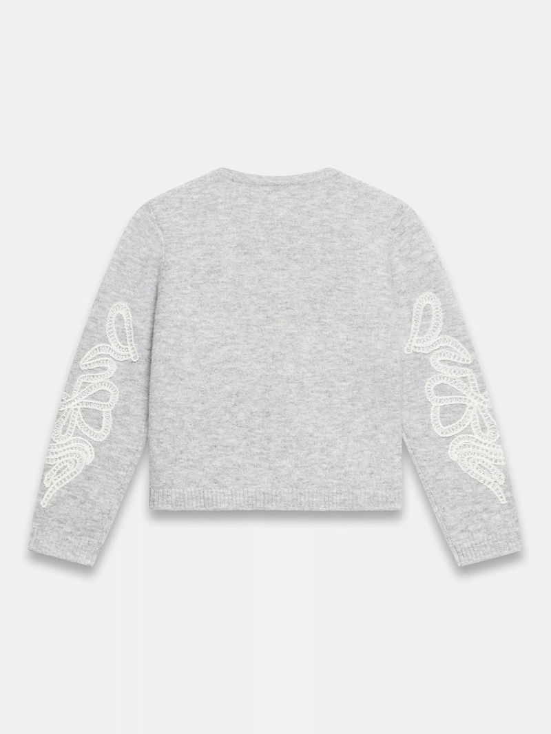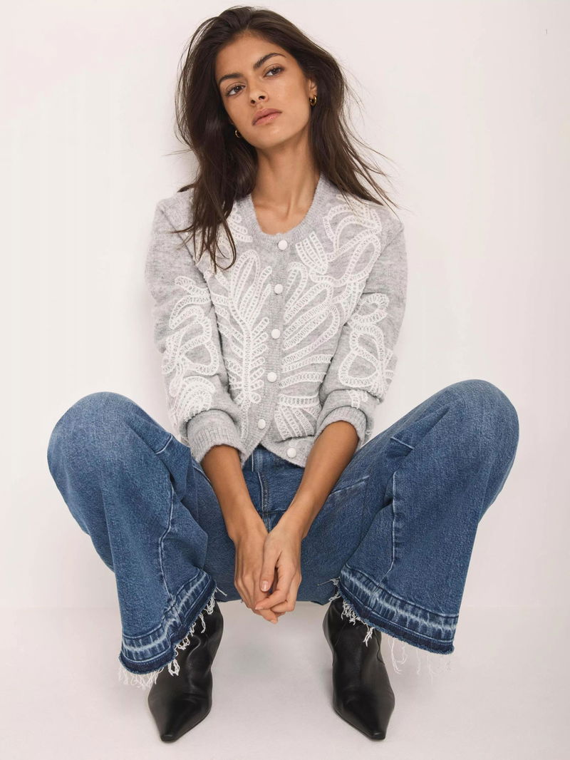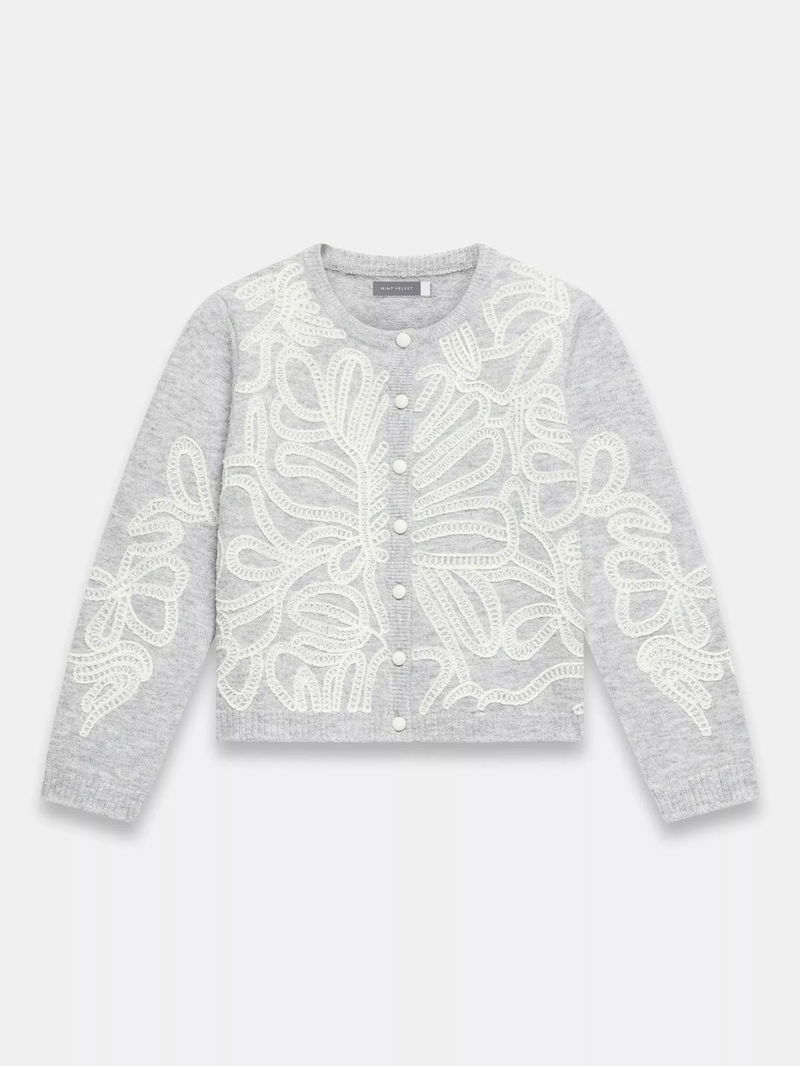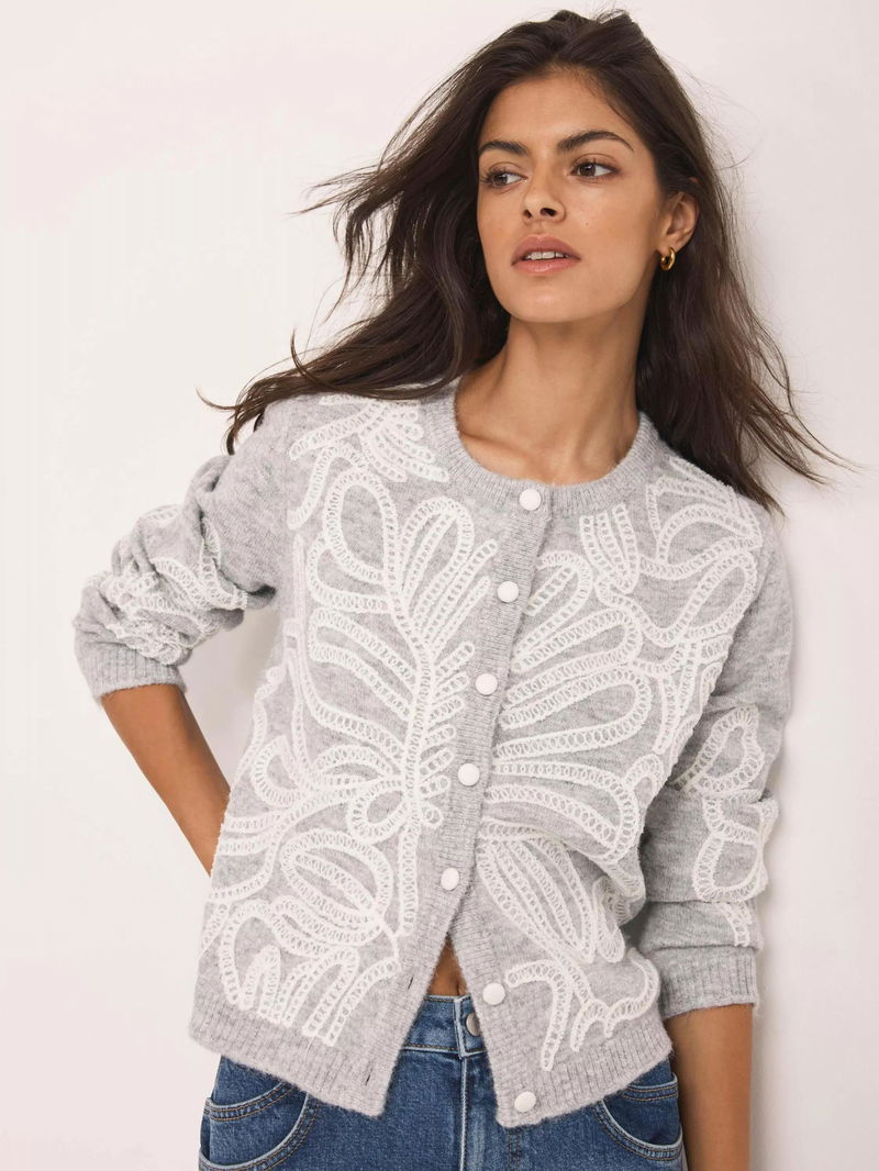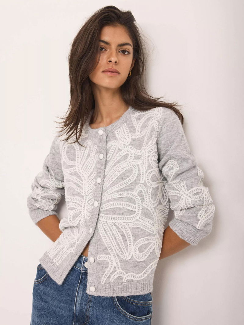 Grey cardigan featuring a crew neckline, long sleeves, embroidered detailing with a button fastening through the front.