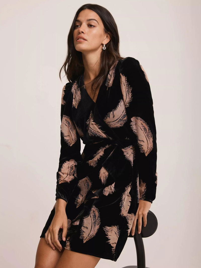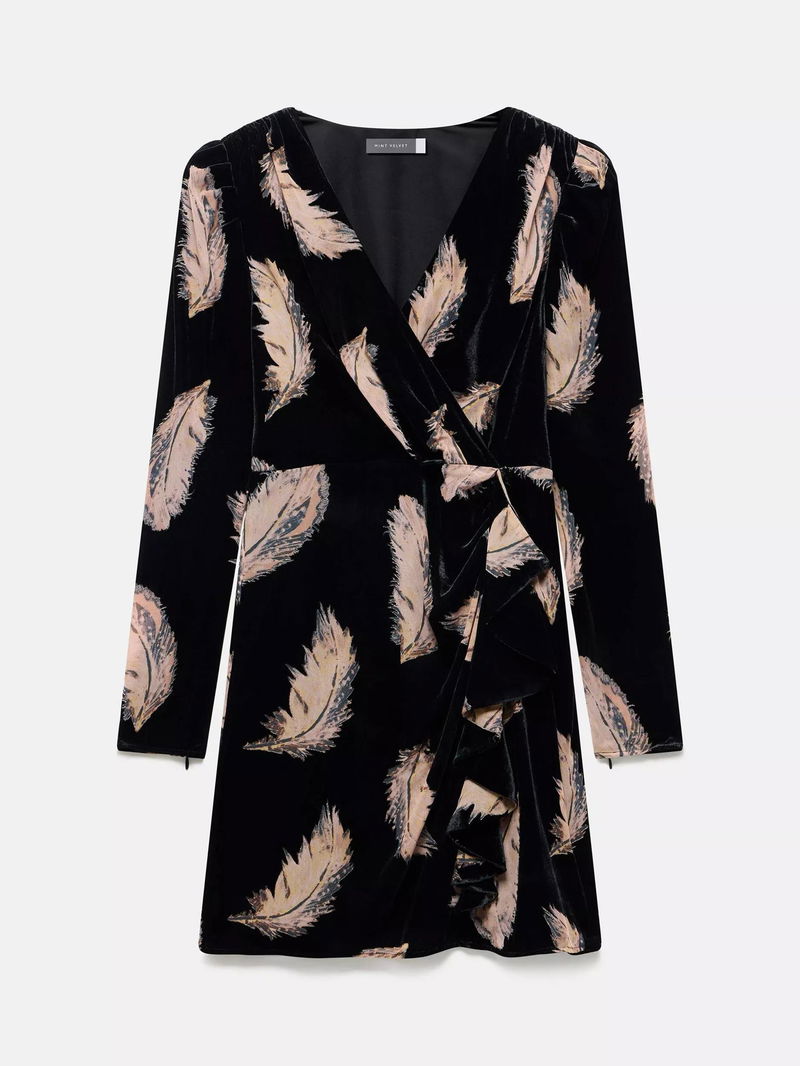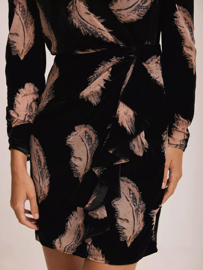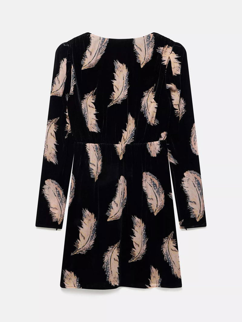 Feather Print Long Sleeve V Neck Mini Dress
