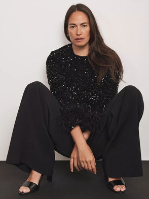 Be party-ready in this velvet jersey top with feather-trimmed cuffs. The boat neck and long sleeves keep you comfortable while the playful details invite conversation.