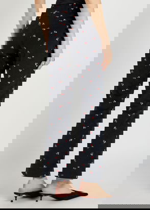 A pair of floral lace trousers in a high rise silhouette with side pockets and cropped hemlines.