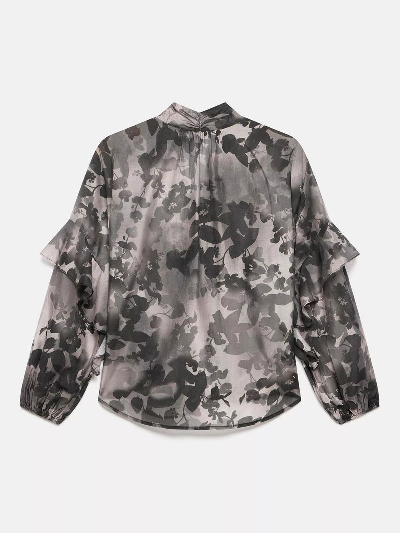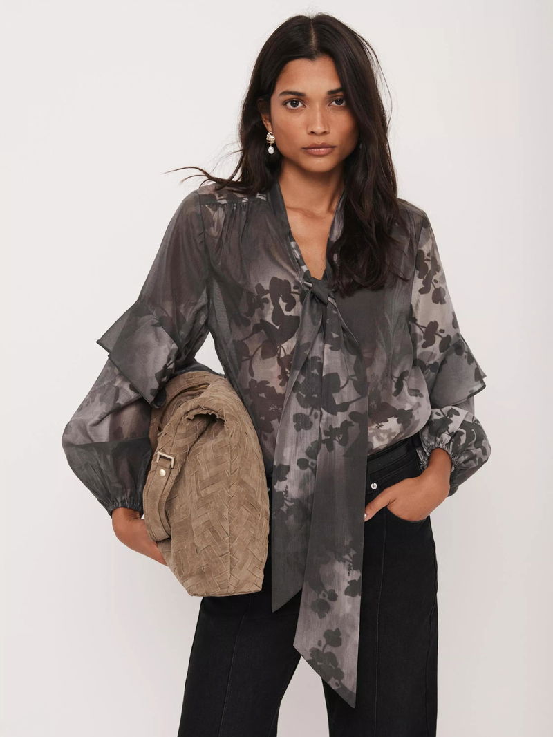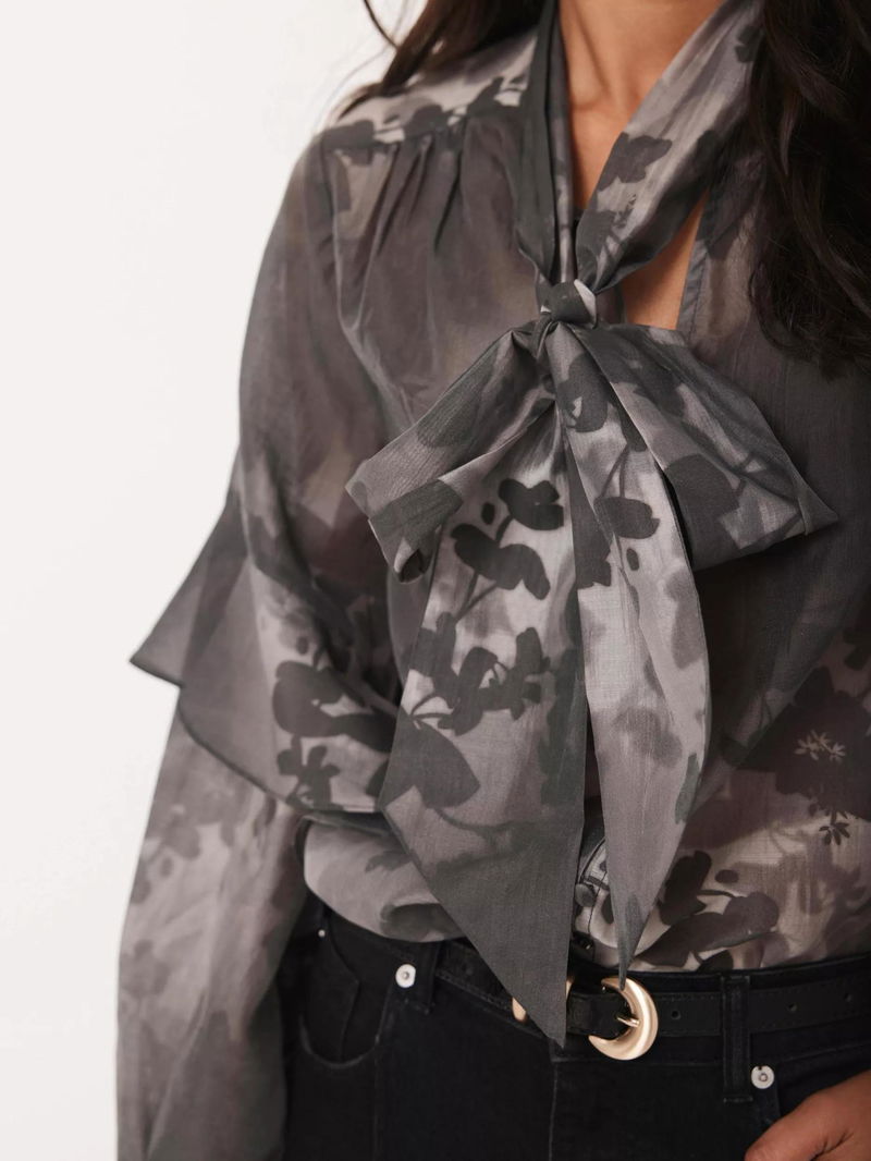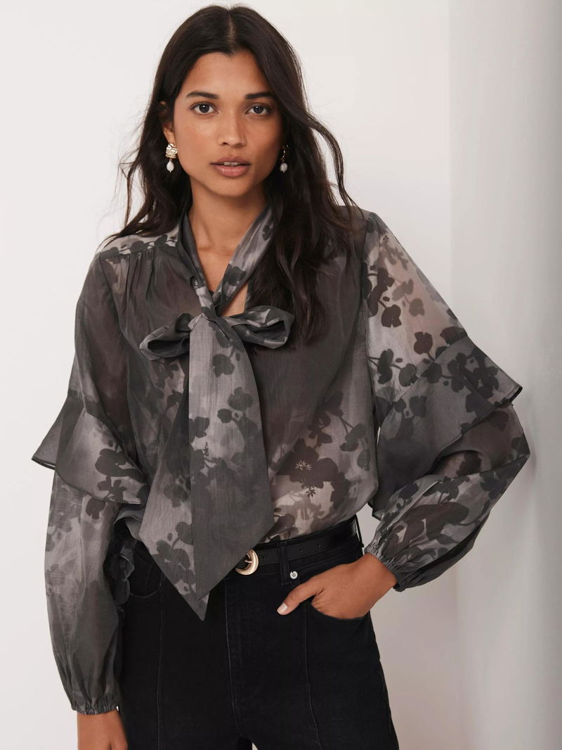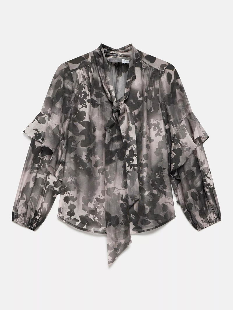 A floral print blouse featuring a V-neckline, long sleeves, ruffle detail, elasticated cuffs, scoop hemline with a tie fastening through the front.