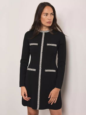 Navy boucle dress in a mini silhouette with a statement lace collar, short sleeves and ornate button fastenings through the front.
