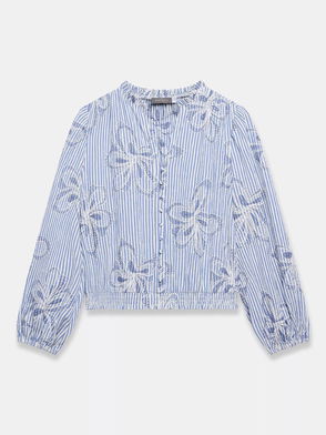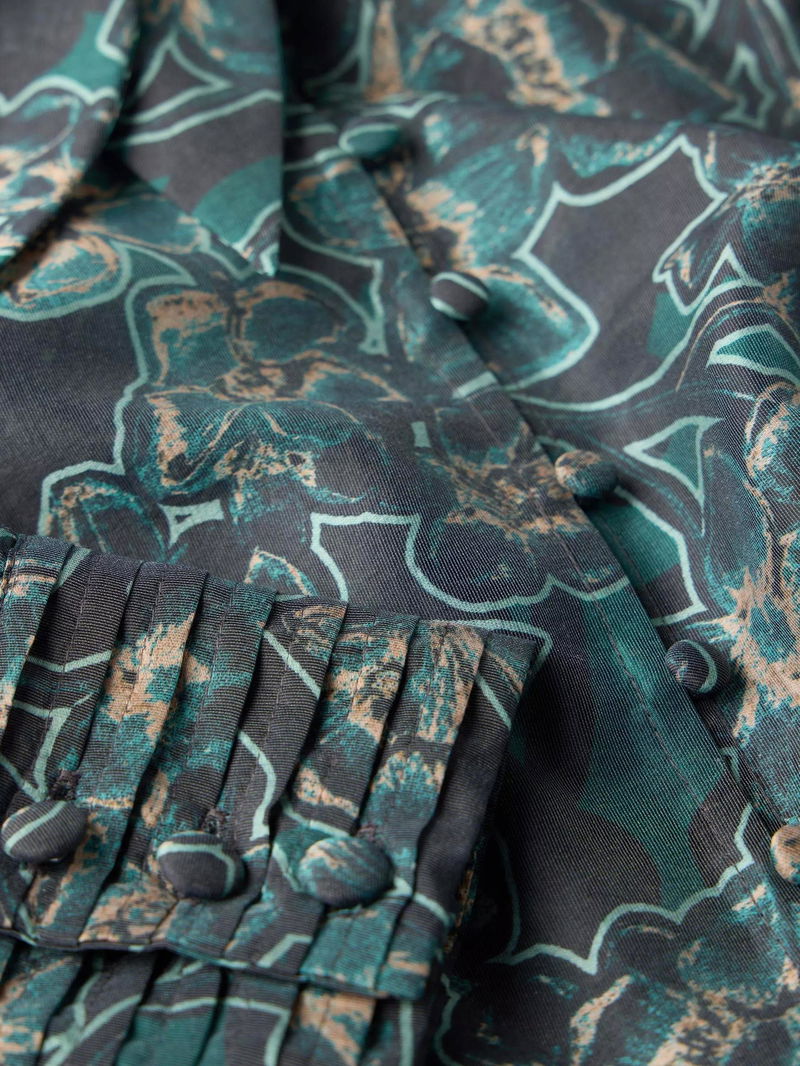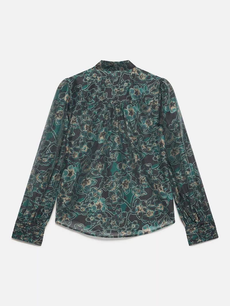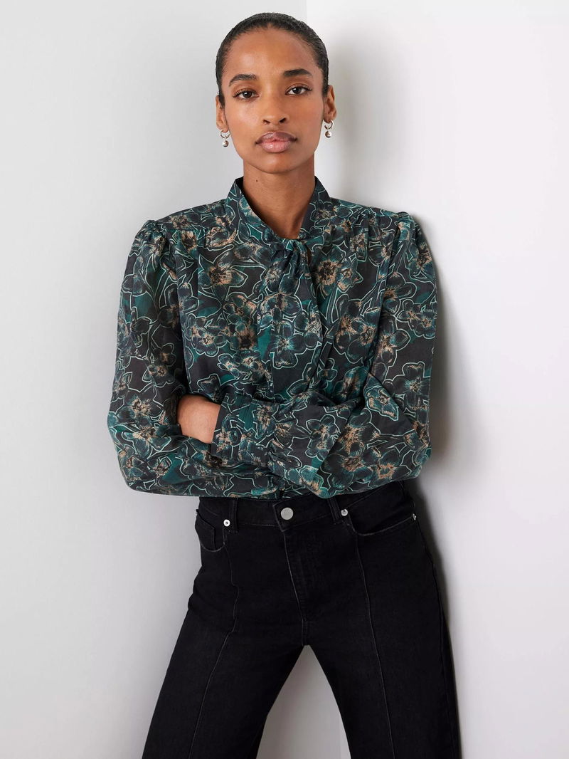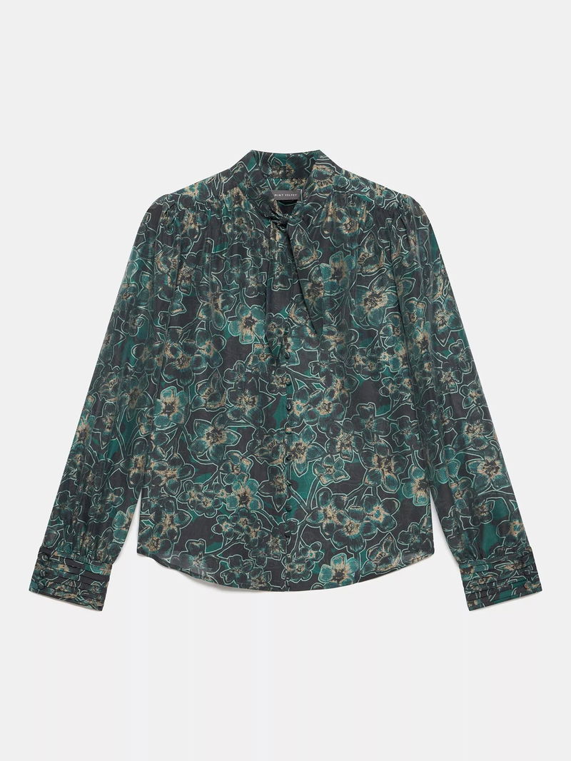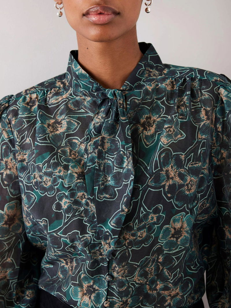 A floral print blouse featuring a tie neckline, long sleeves, pin-tuck buttoned cuffs, scoop hemline with a button fastening through the front.