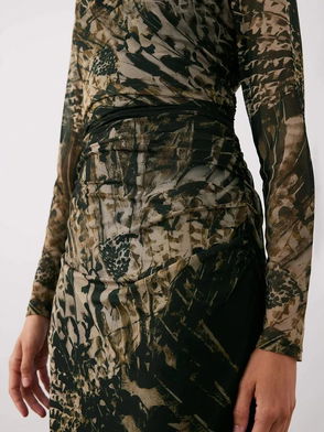 A geometric print dress in a midi silhouette featuring a contrast classic collar, long sleeves, contrasting button cuffs, flare hemline with a concealed button fastening through the front.