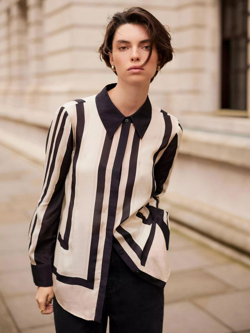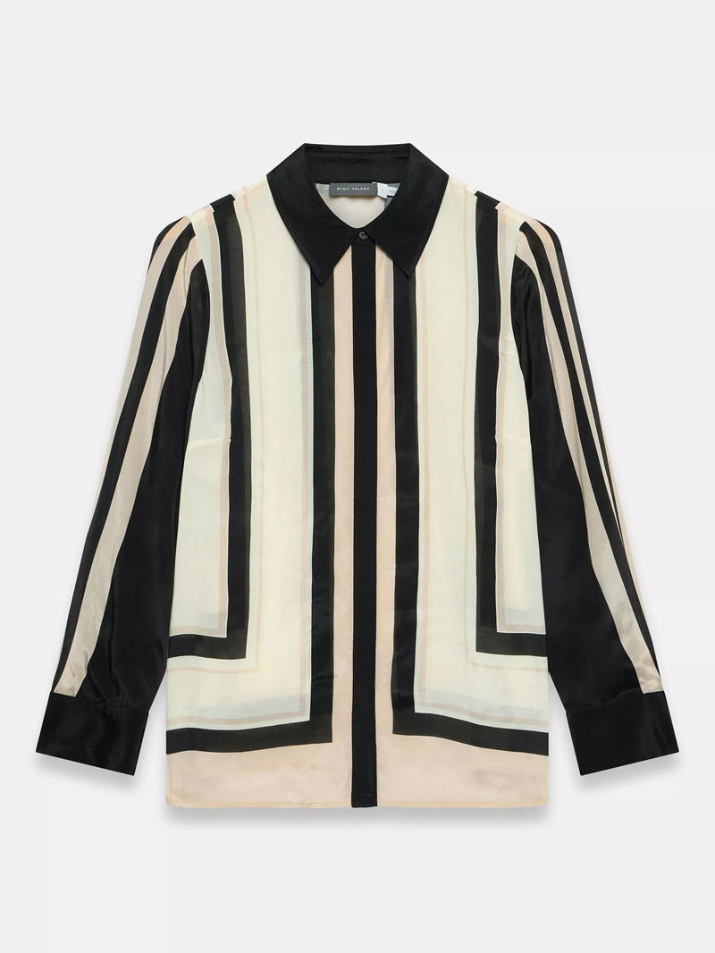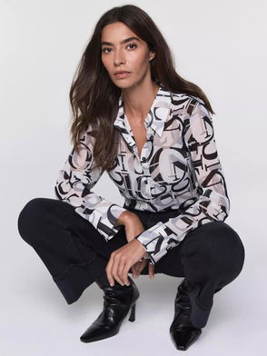 A graphic print shirt featuring a classic collar, long sleeves, buttoned cuffs with a concealed button fastening through the front.