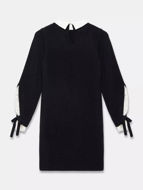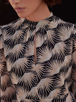 A heart print dress in a mini silhouette featuring a classic collar, short puff sleeves, button detail, rear tie fastening, contrast trim with button fastenings through the front.