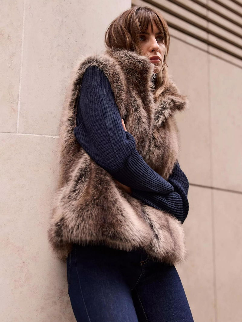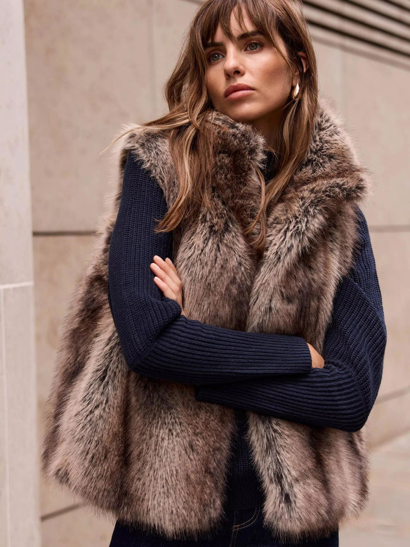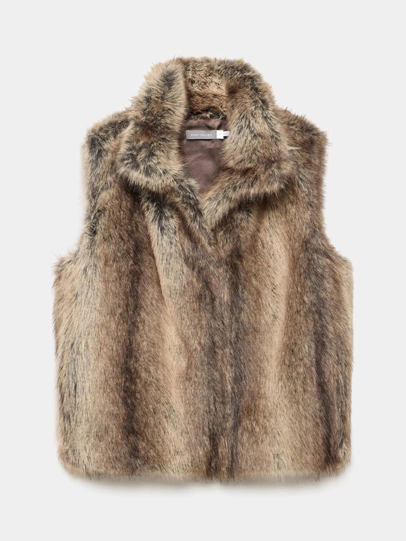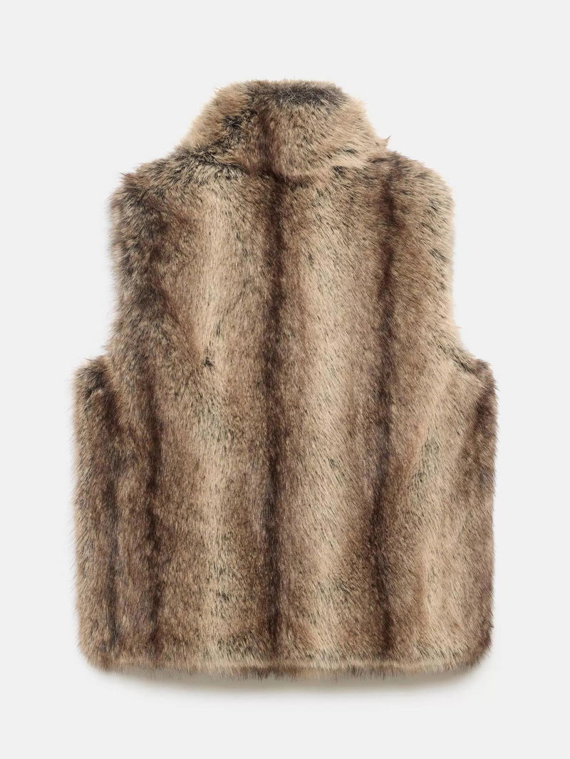 A faux fur gilet featuring a high neckline and fastening through the front.