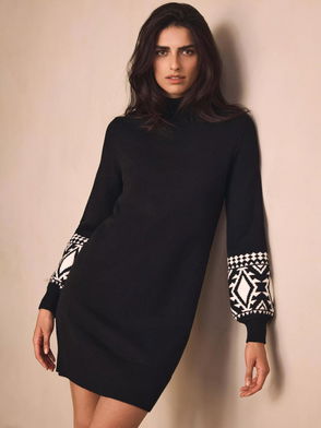A knit jumper mini dress with a high neckline featuring long sleeves and elongated cuffs.