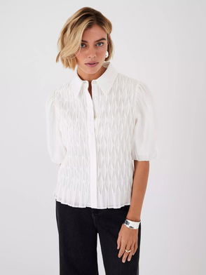 A jacquard top with a crew neckline, short puff sleeves with pearl and crystal embellished buttons fastening through the front.