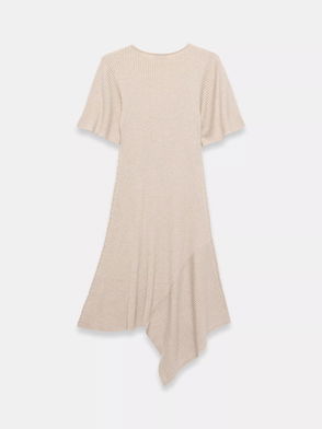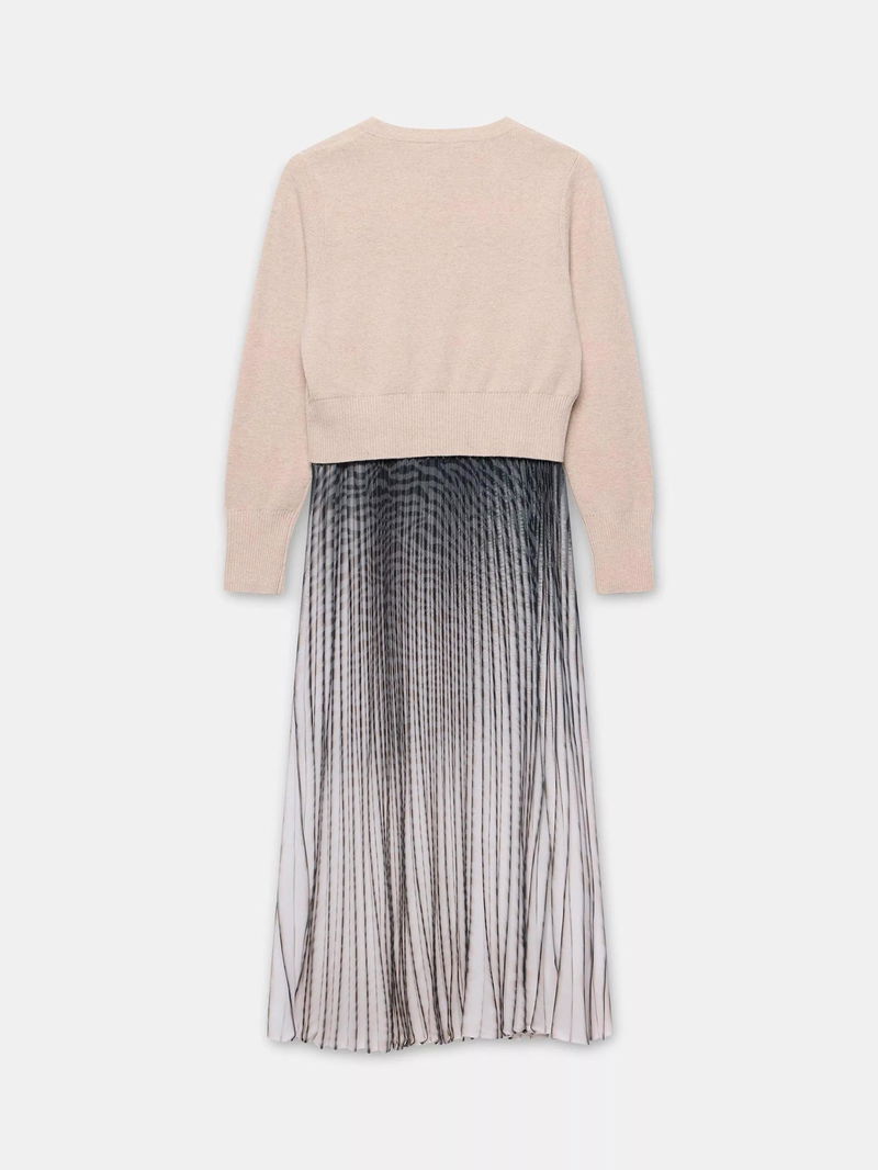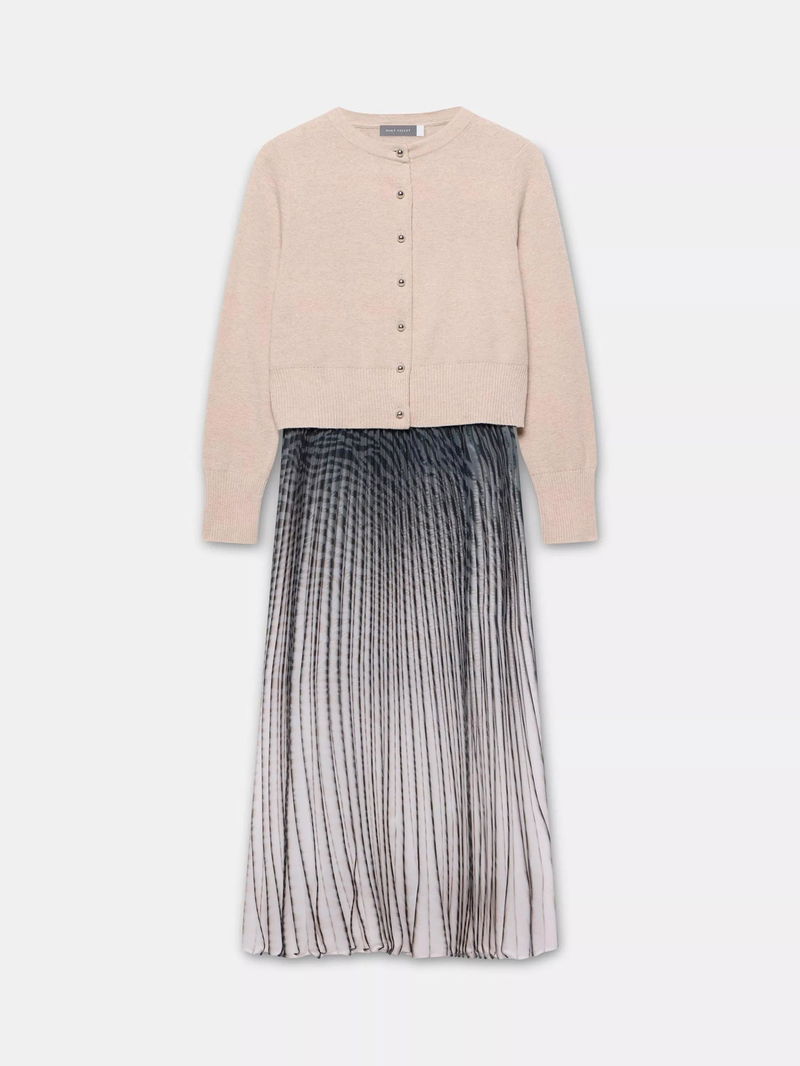 A layered dress in a midi silhouette featuring a knit cardigan with a crew neckline, long sleeves with button fastenings through the front and a pleated dress.