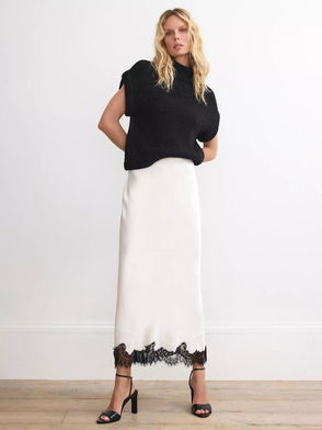 Created for a sophisticated and modern look, this elegant midi skirt is cut from a delicate lace fabric. The sheer fluted hemline adds a subtle twist to a classic silhouette, creating a fluid feel. Finished with a discreet zip fastening, it's a versatile piece that can be effortlessly styled for any occasion.