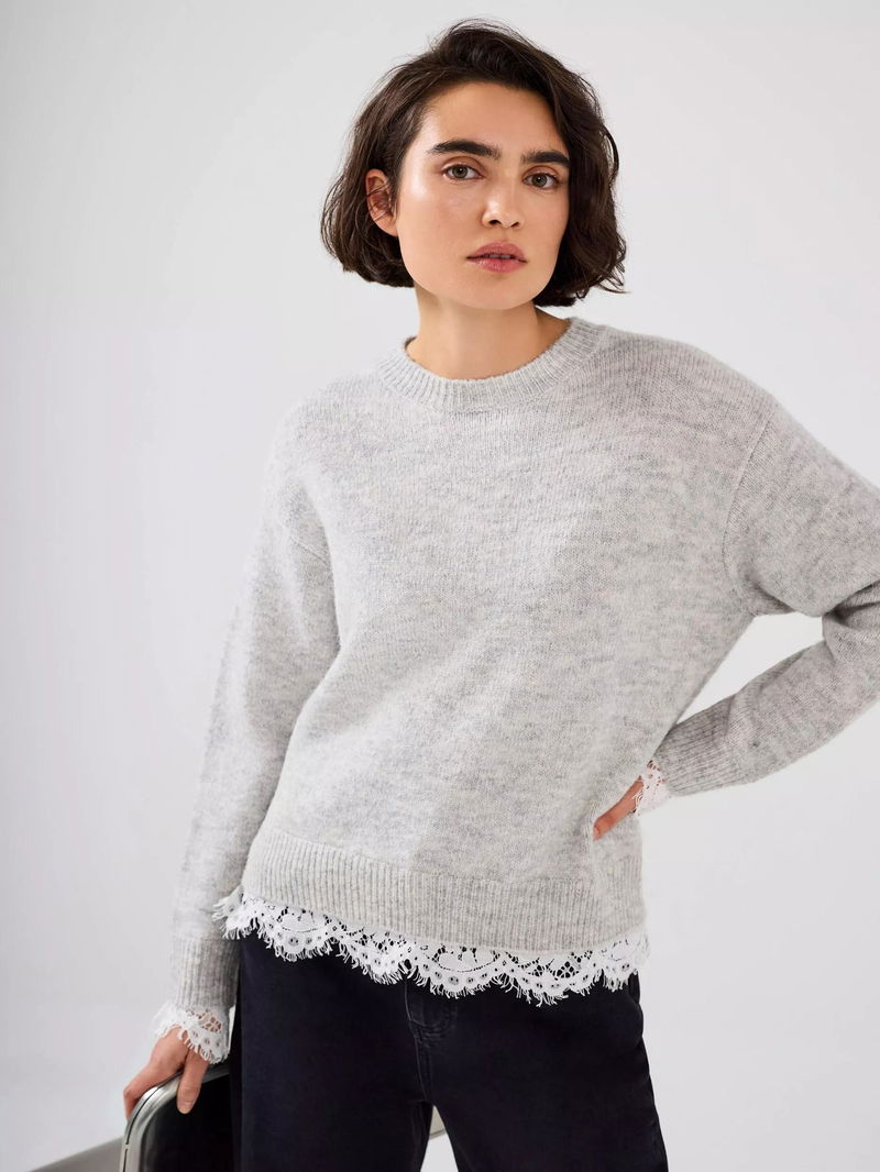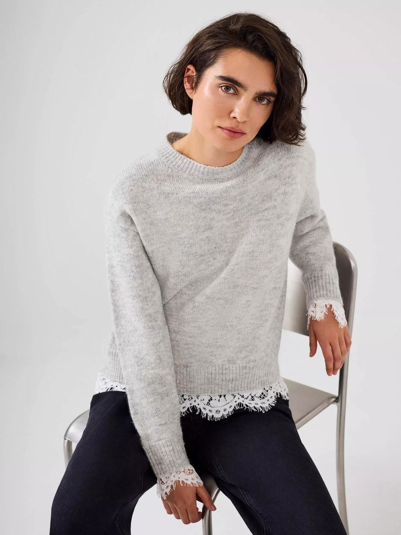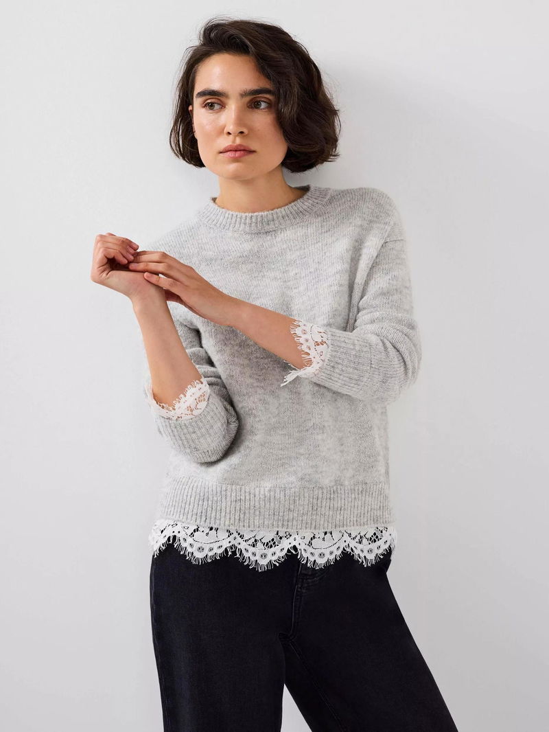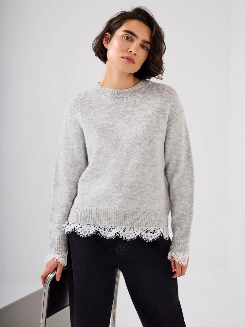 A wool-blend jumper featuring a crew neckline, long sleeves and lace trim detailing.