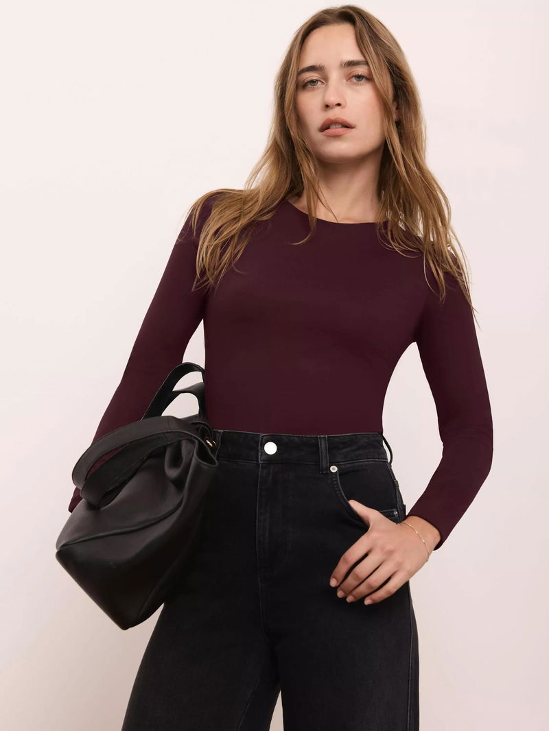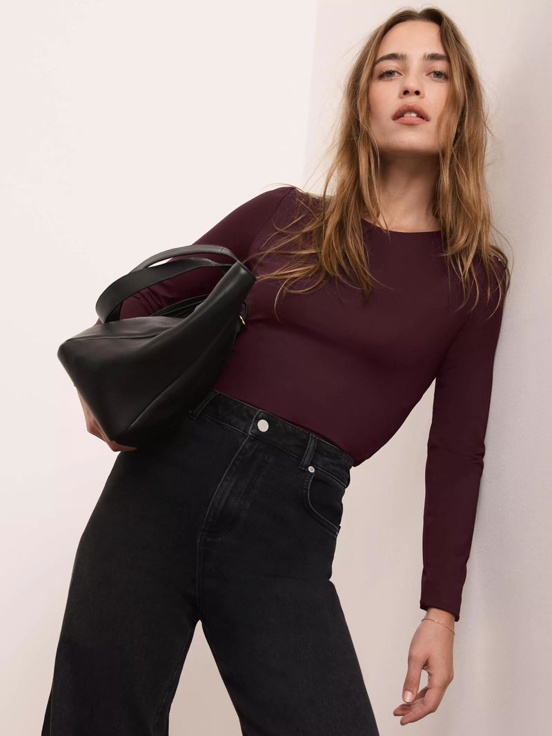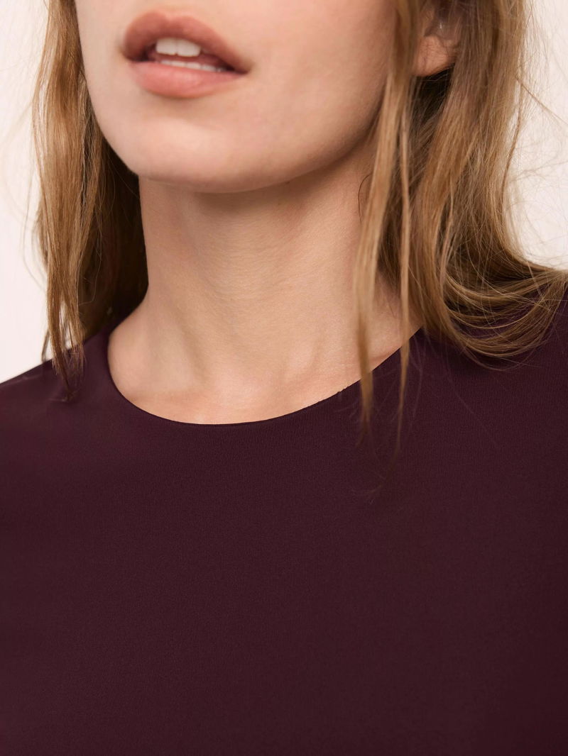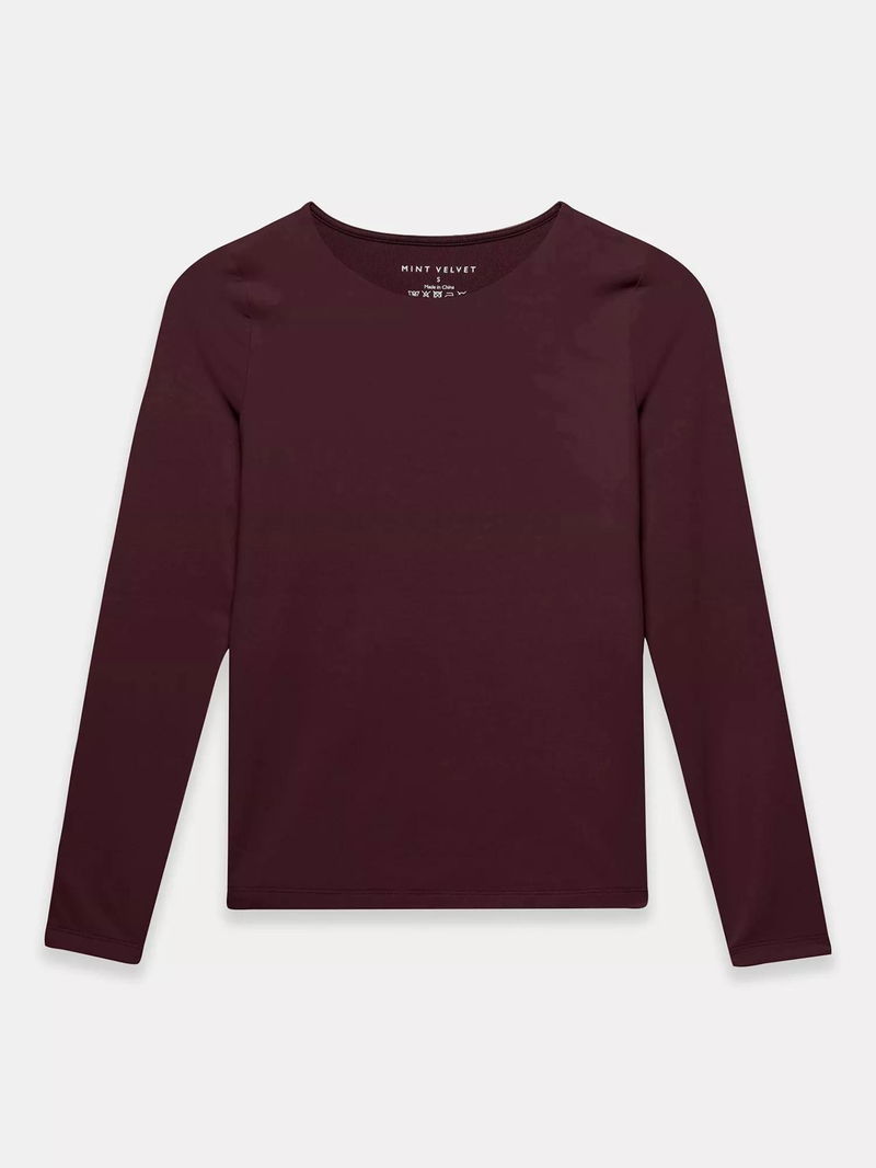 Burgundy-tone top featuring a crew neckline and long sleeves, perfect for everyday wear.