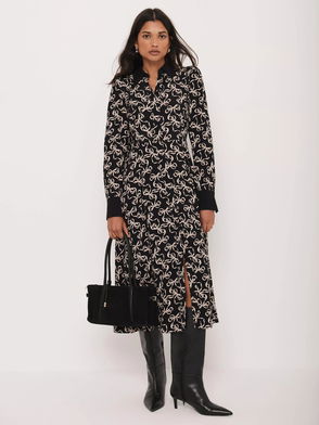 A dress in a maxi silhouette with a V_neckline, button-back collar, darted detailing, nipped waist, long sleeves, buttoned cuffs and a concealed button fastening through the front.