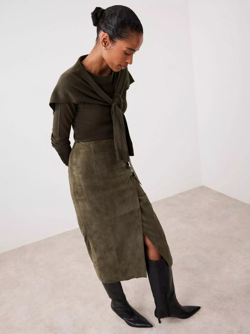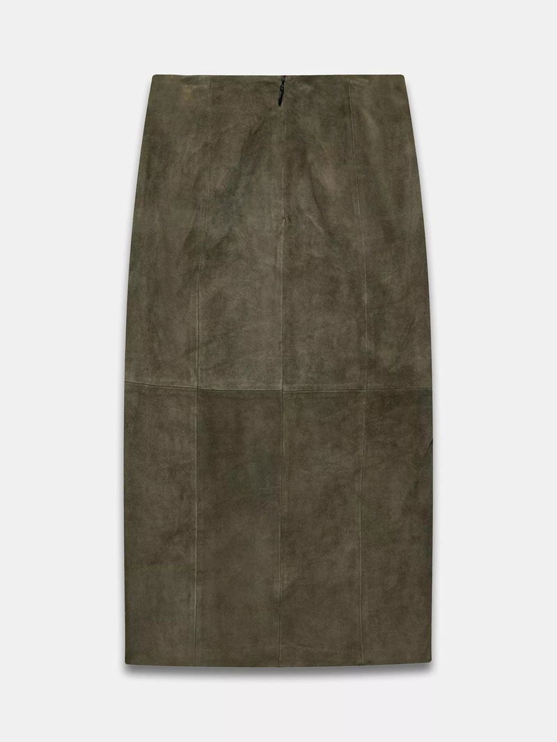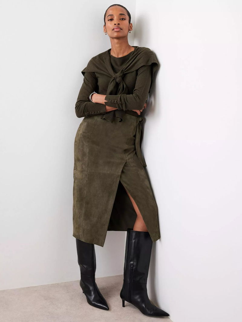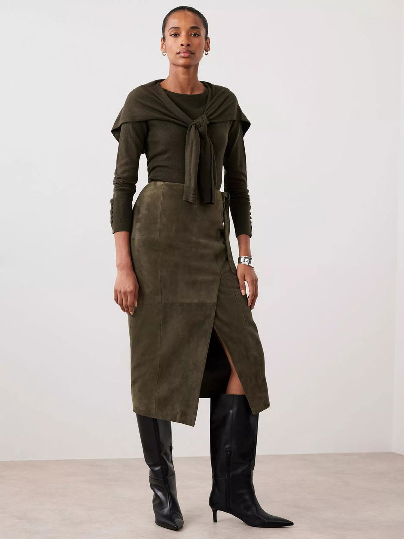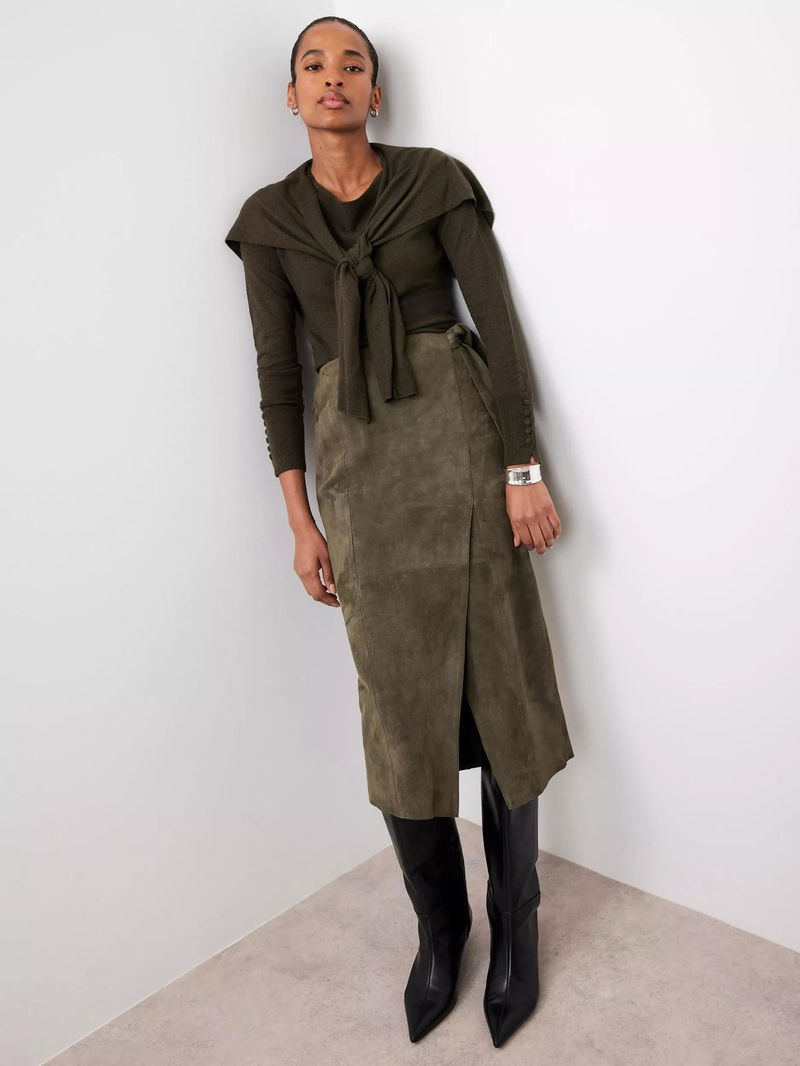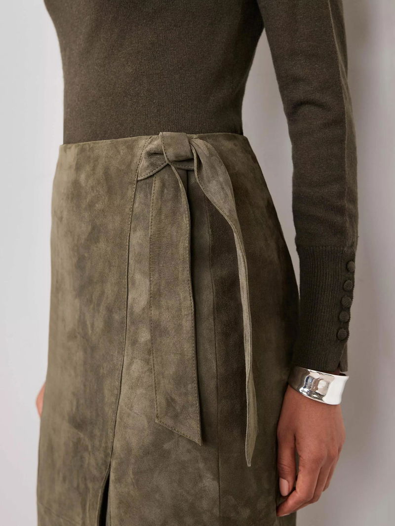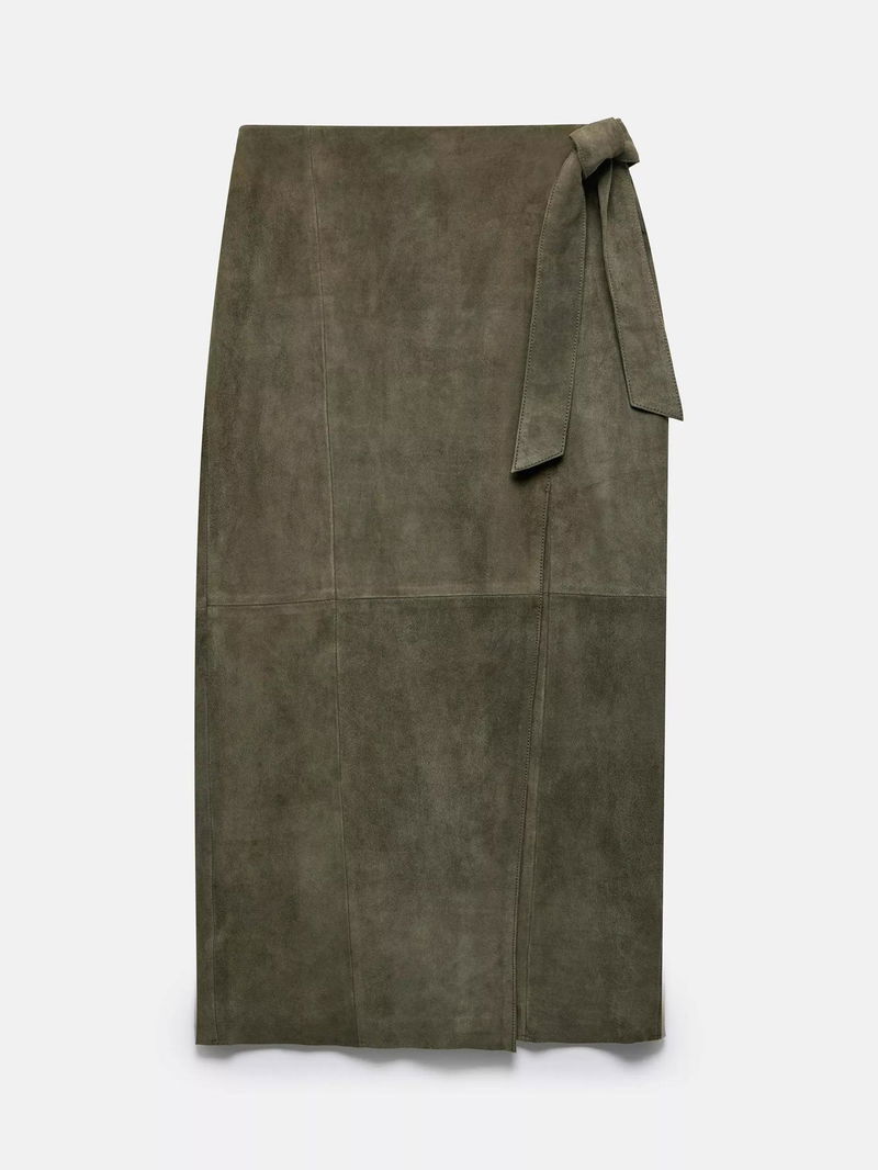 A suede skirt in a midi silhouette featuring a wrap featuring, tie side and zip fastening through the back.