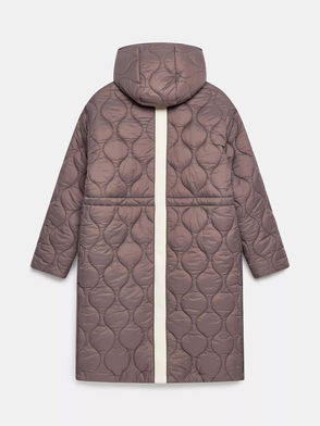 A quilted coat with a funnel neckline, long sleeves, welt pockets, popper split sides featuring a popper fastening through the front.