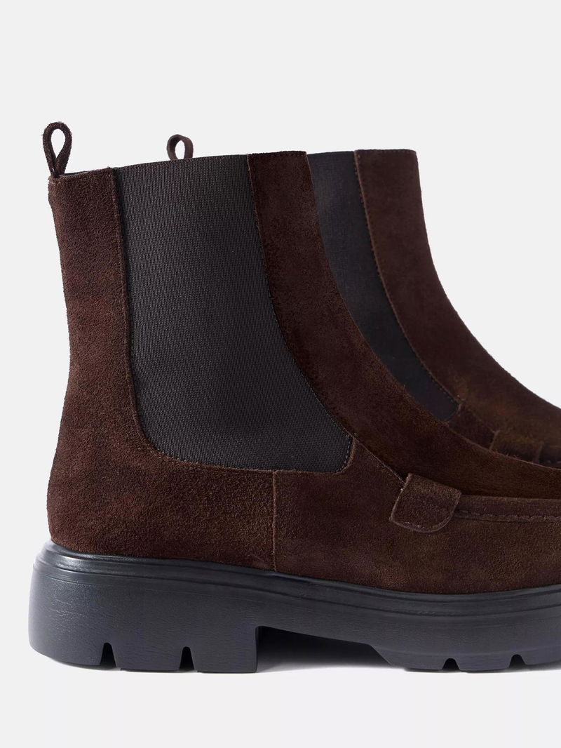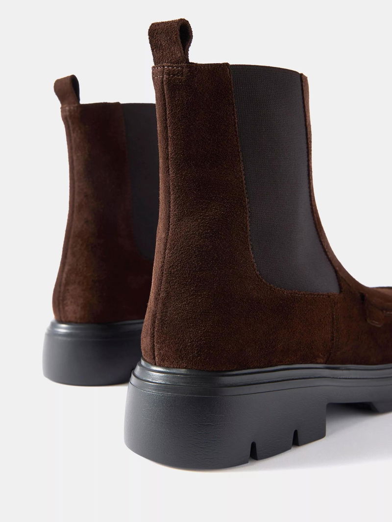 These Reece suede Chelsea boots feature a round toe, trim detail, chunky cleated sole, elasticated sides and pull tabs.