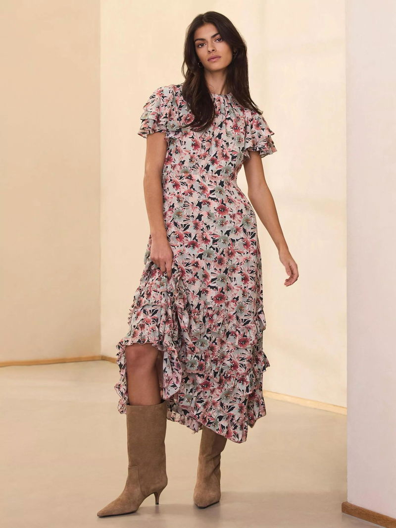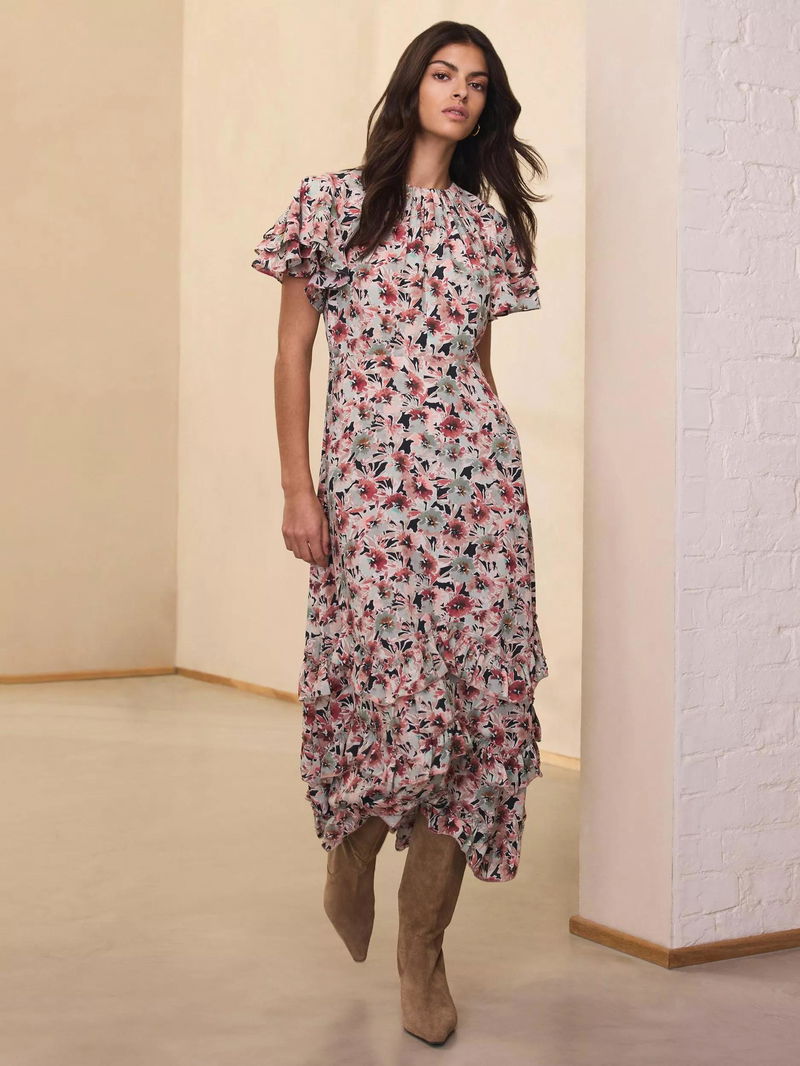Floral print dress in a maxi silhouette featuring a gathered crew neckline, short ruffle sleeves, and a layered ruffle hemline with a zip fastening through the back.