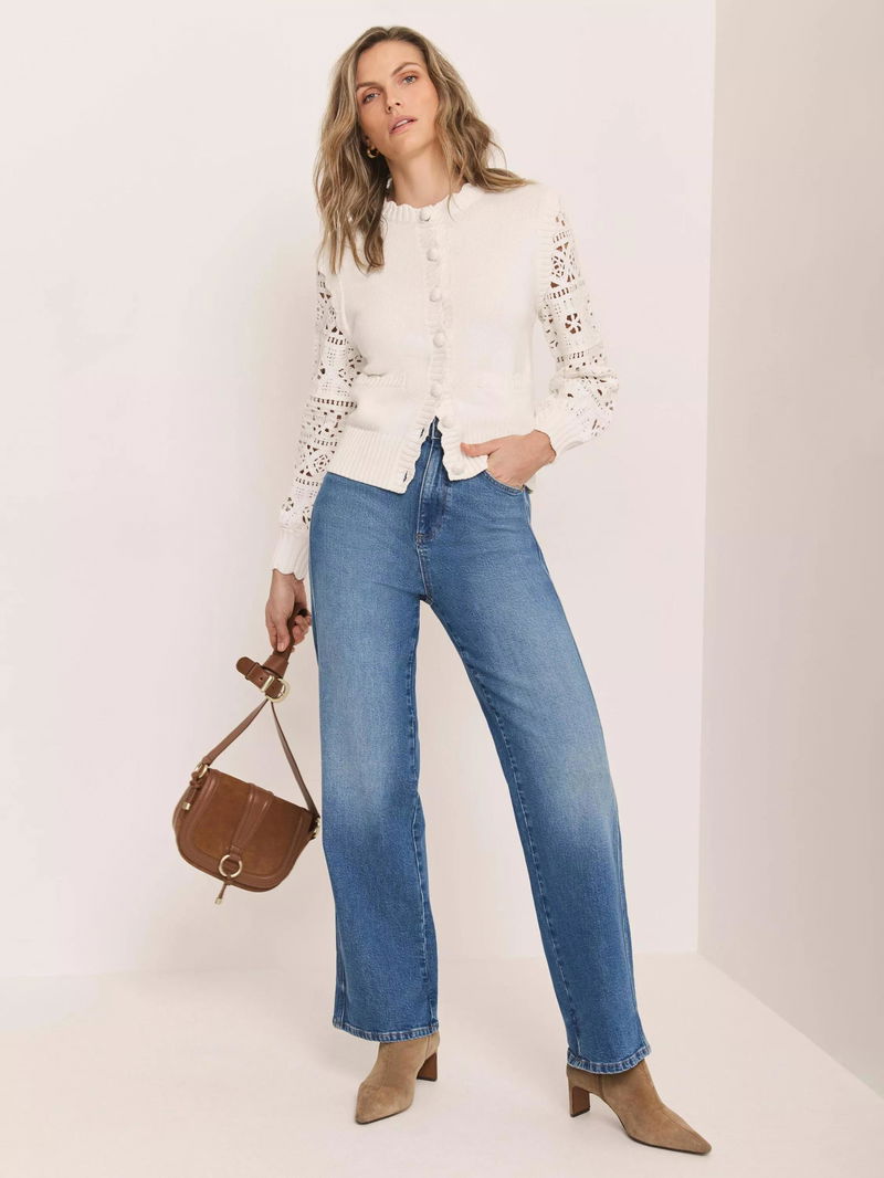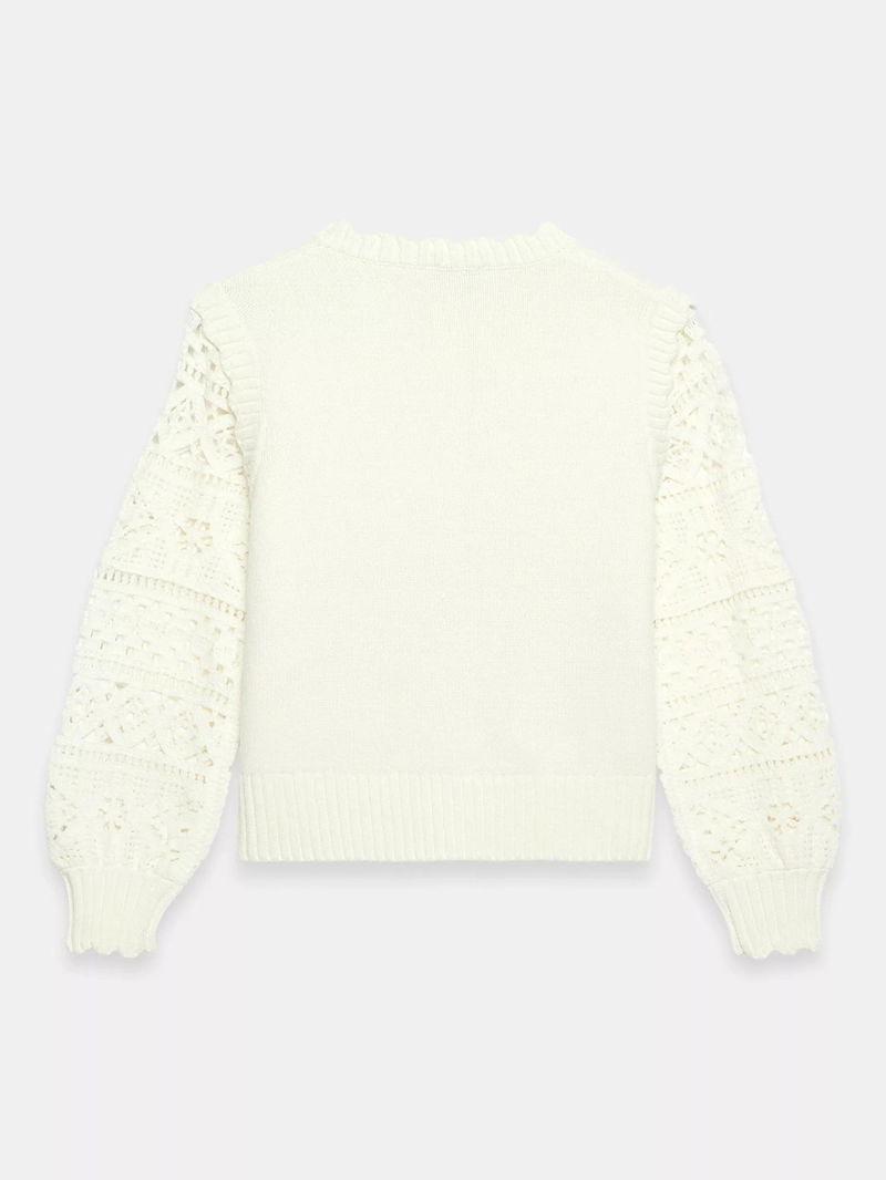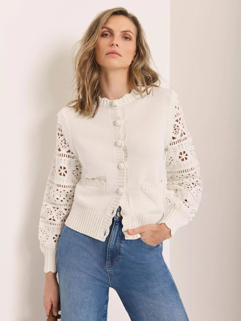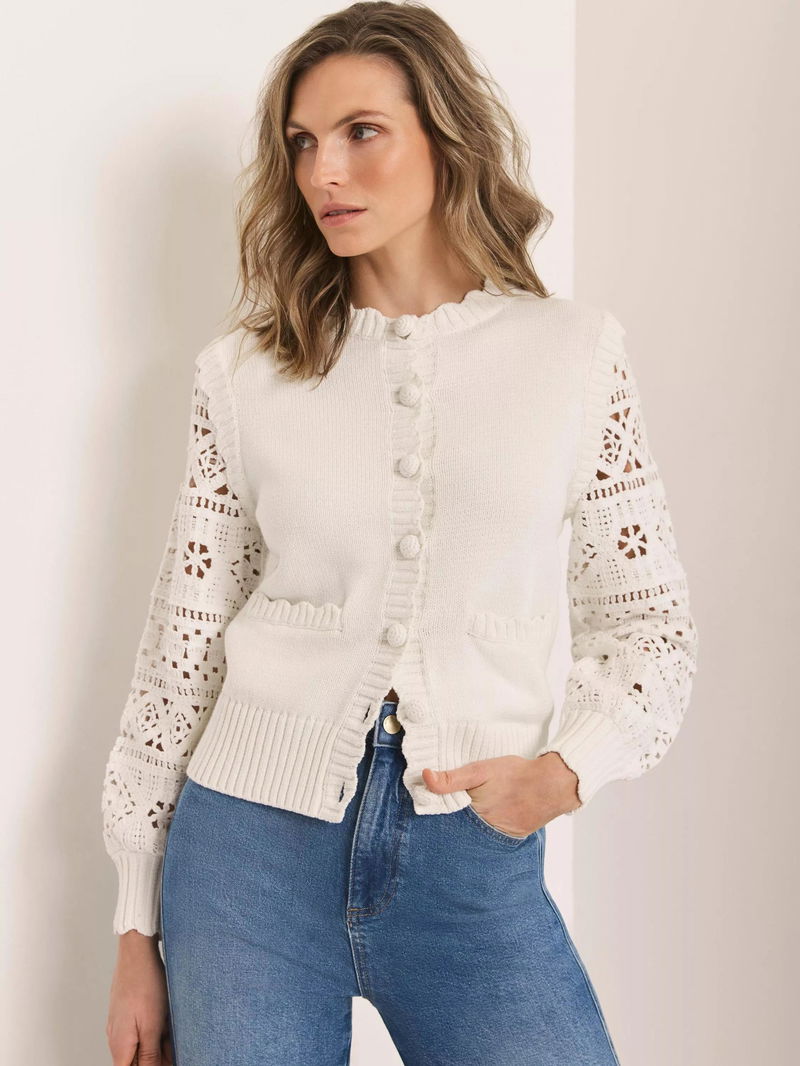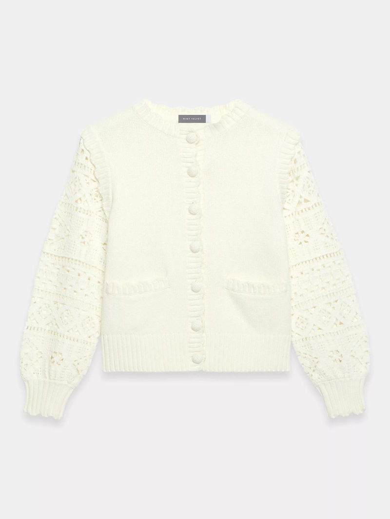 A cotton-rich cardigan featuring a crew neckline, scallop trim, crochet sleeves, welt pockets, ribbed trim with a button fastening through the front.