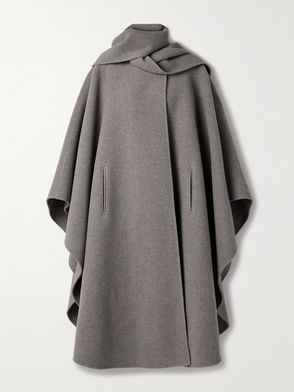 Light grey coat featuring long sleeves, welt pockets, detachable scarf detail with a button fastening through the front.