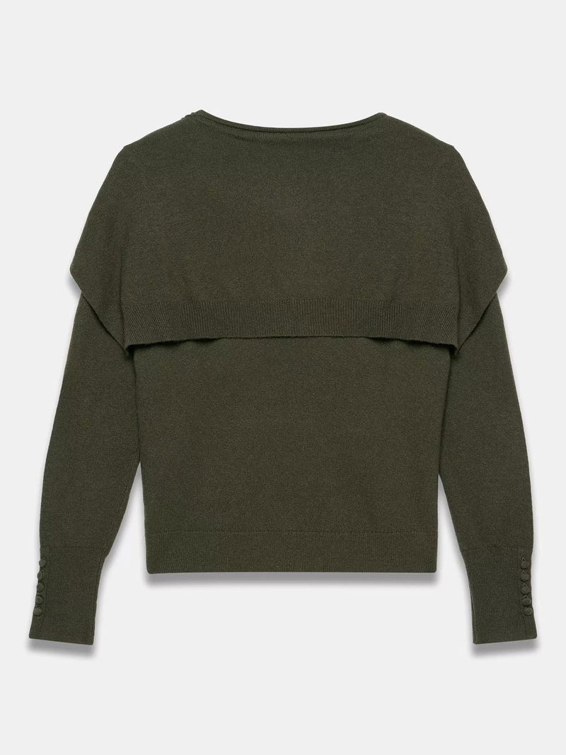 A cotton-blend jumper with a crew neckline, layered non-detachable scarf detail, and long sleeves featuring button detailing.