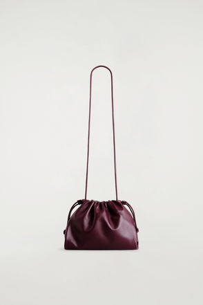 Burgundy sequin embellished clutch bag featuring a gold-tone detachable chain shoulder strap and drawstring closure.