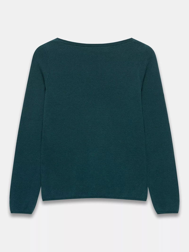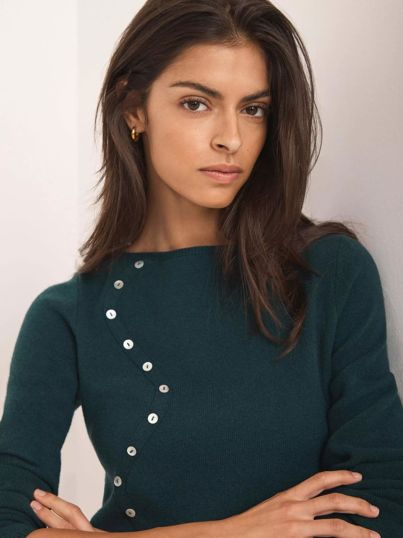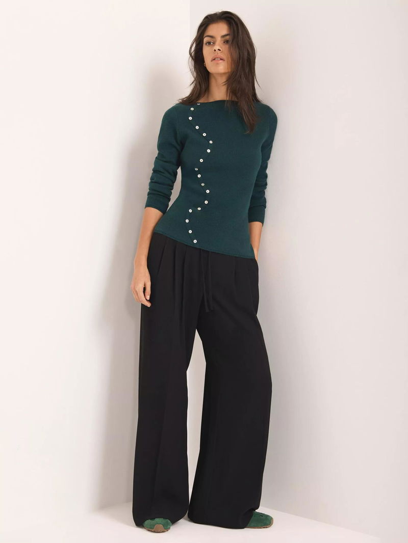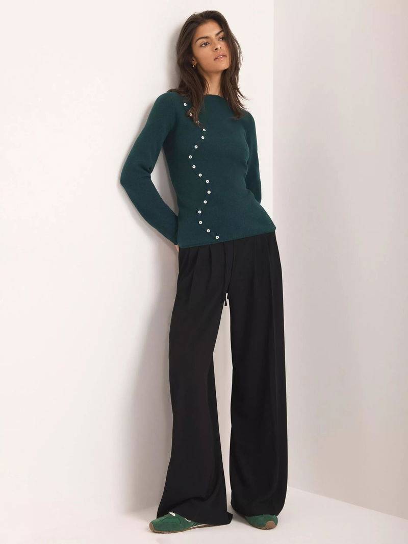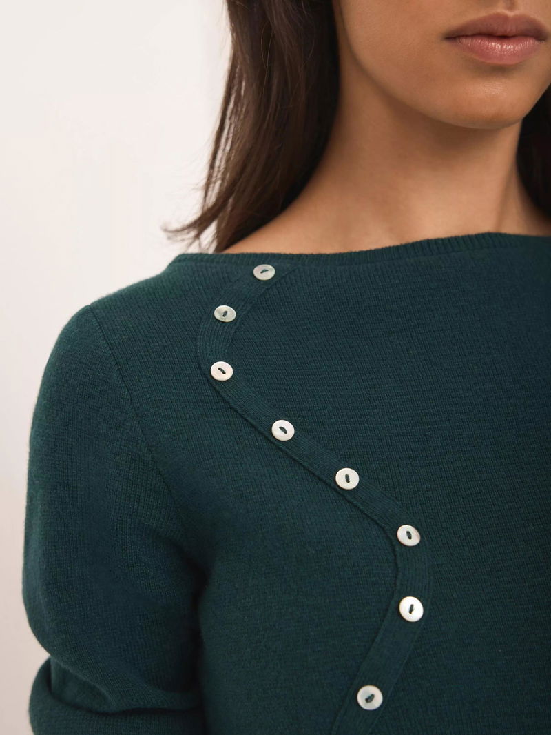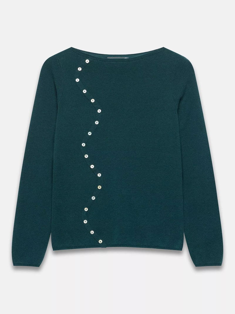 A knit jumper featuring a slash neckline, long sleeves and button detail through the front.
