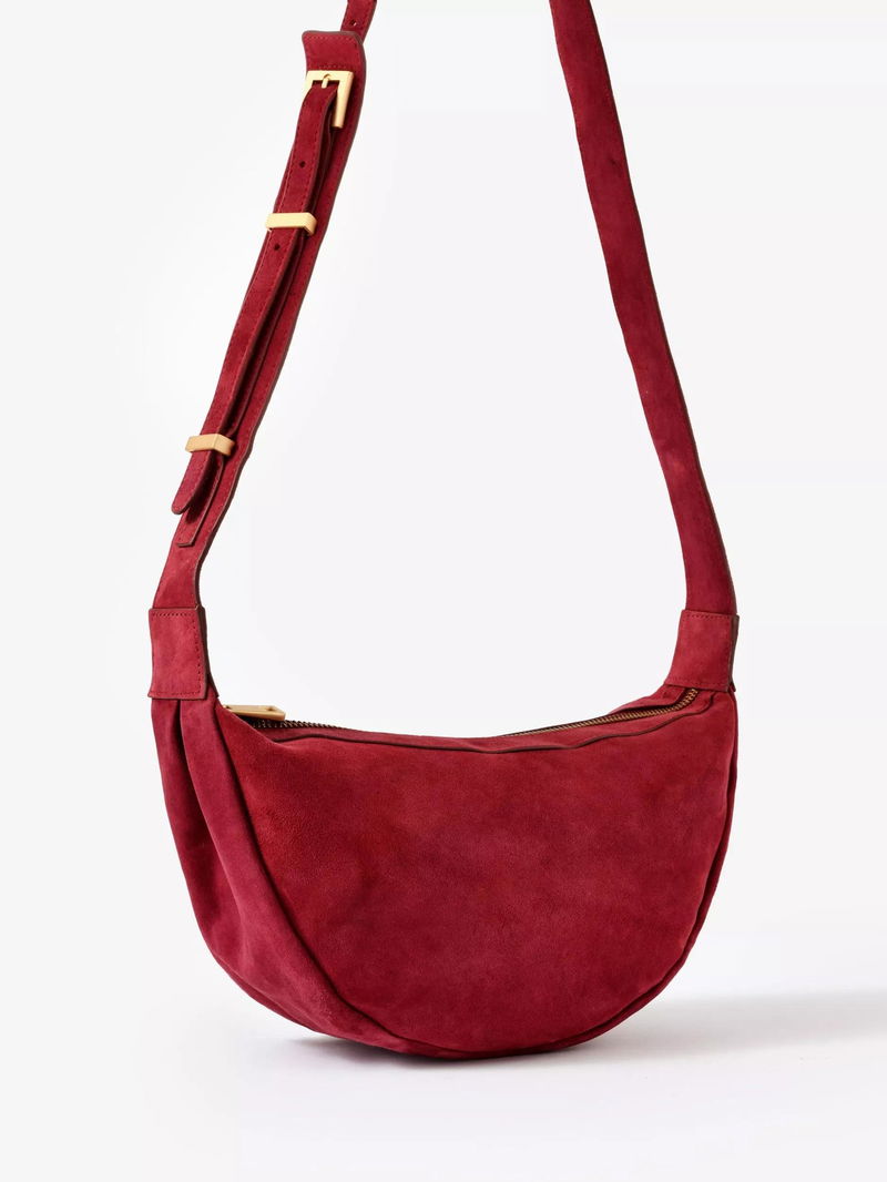 A suede scoop sling bag with a zip along the top and a buckled crossbody strap.