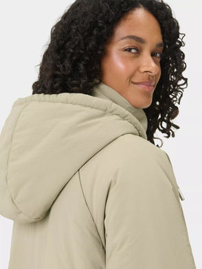 A arka featuring a high neckline, lined hood, adjustable toggles, long sleeves, popper tab cuffs, flap pockets, cinched waistband, drop back hemline, contrast rear trim with a zip and popper fastening through the front.