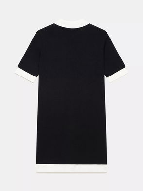 A wavy printed mini dress with a gathered high neckline, short puffed sleeves with gathered cuff and frills along the hem.