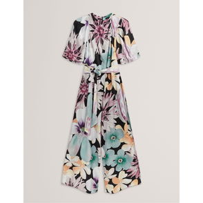 A wide leg jumpsuit with a square neckline, ruffle trim straps, shirred bodice, full length hemlines and contrast stitch trim.