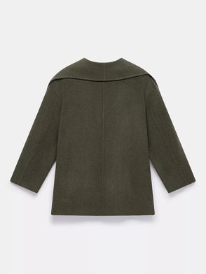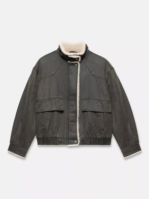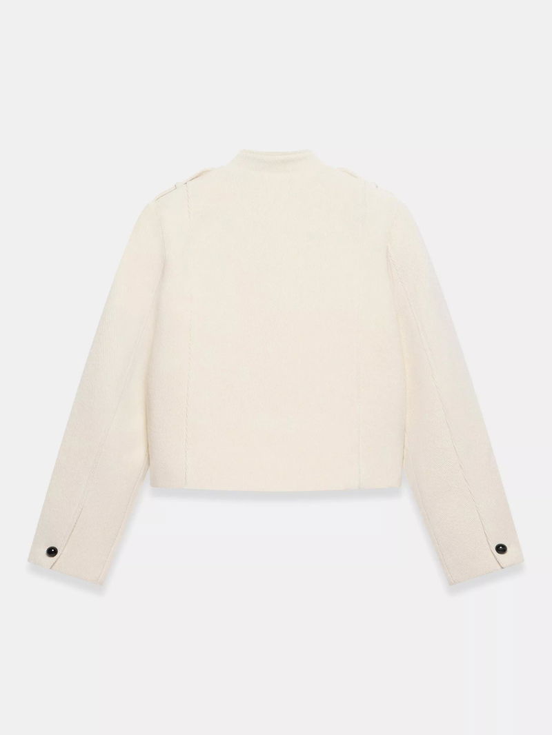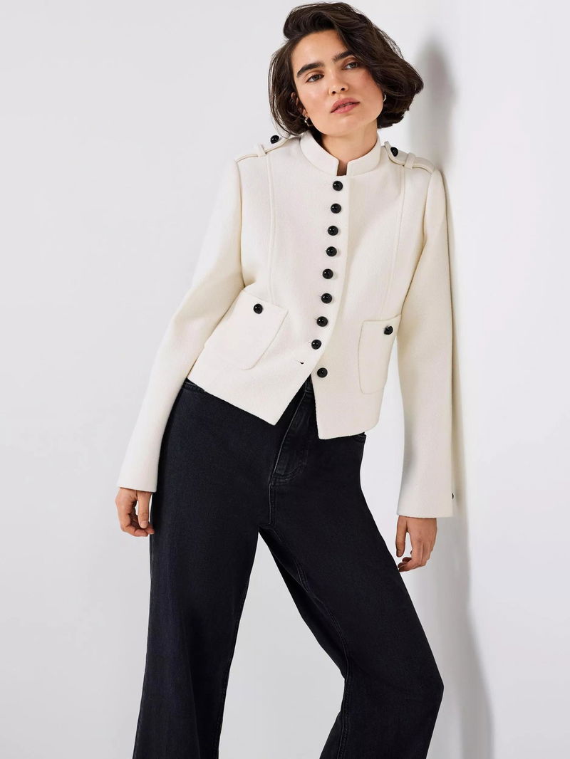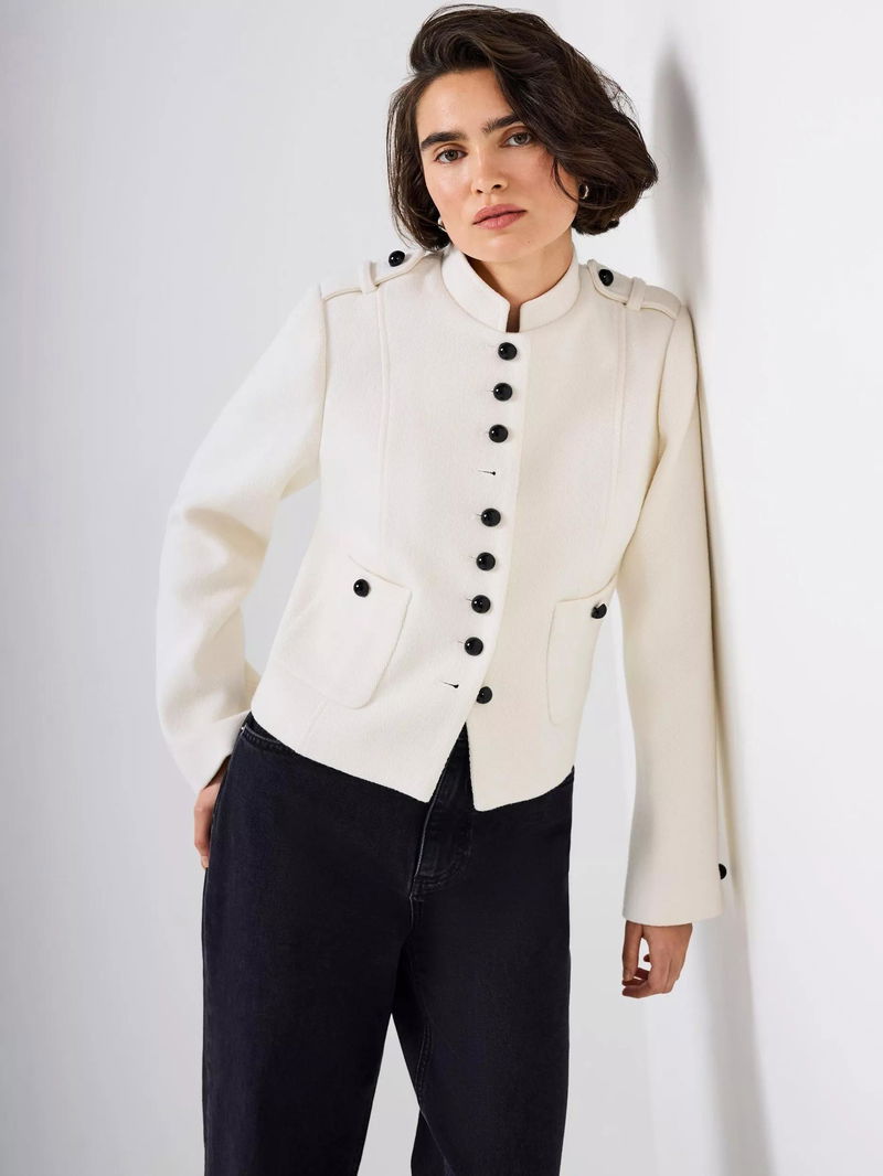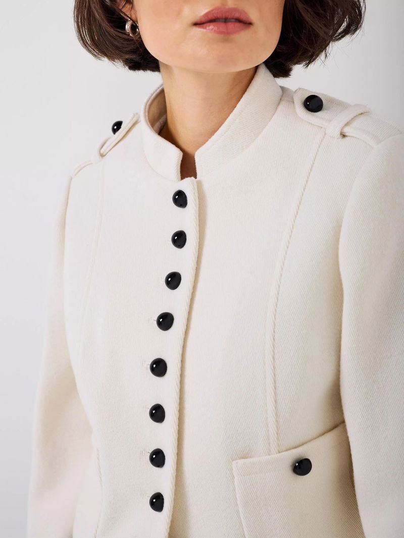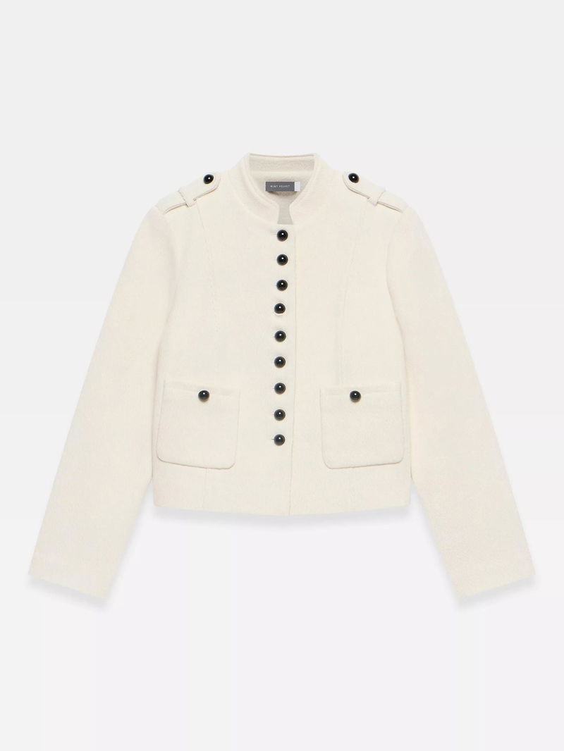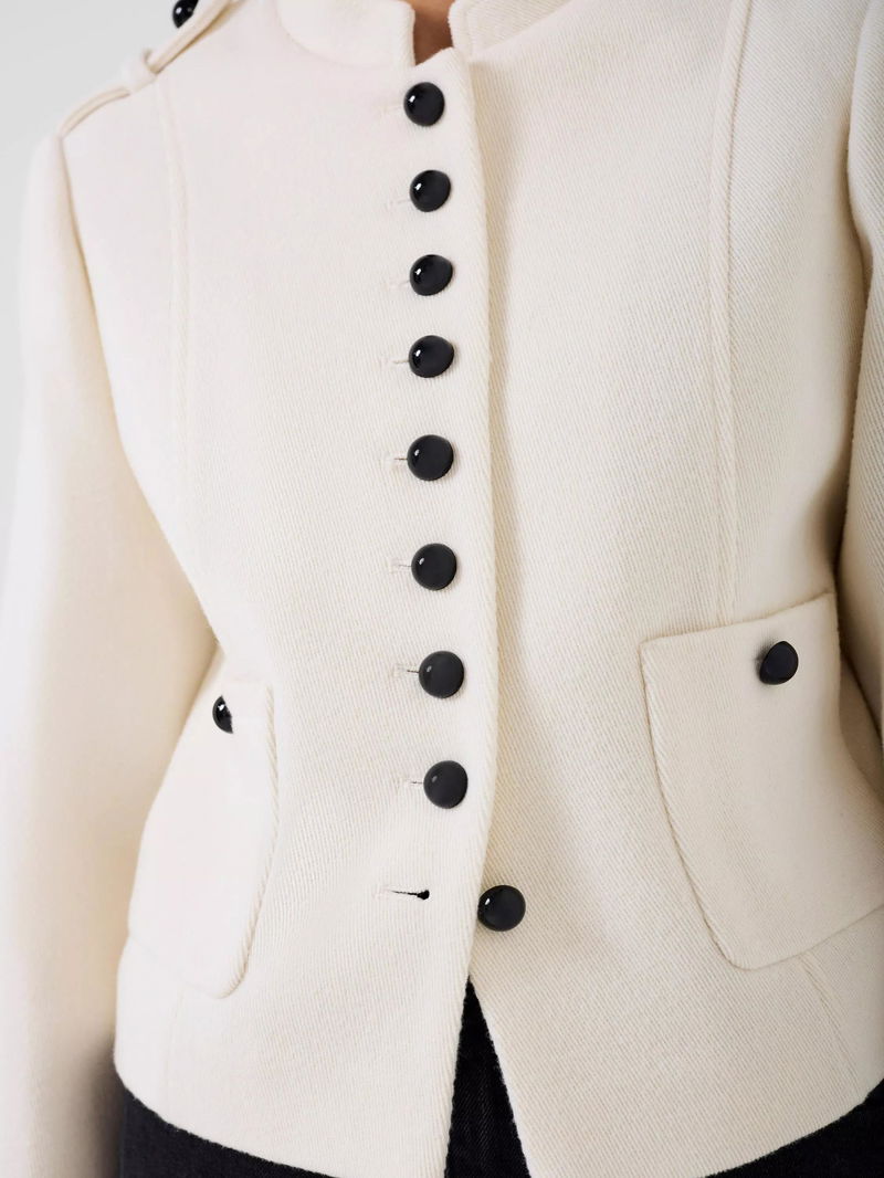 A military jacket featuring a high neckline, epaulettes, long sleeves, buttoned cuffs, square pockets with a button fastening through the front.