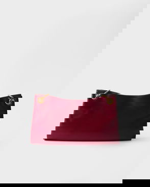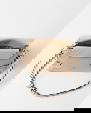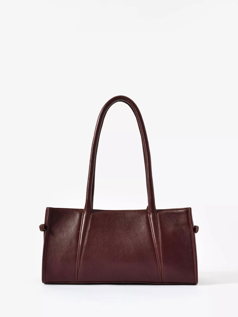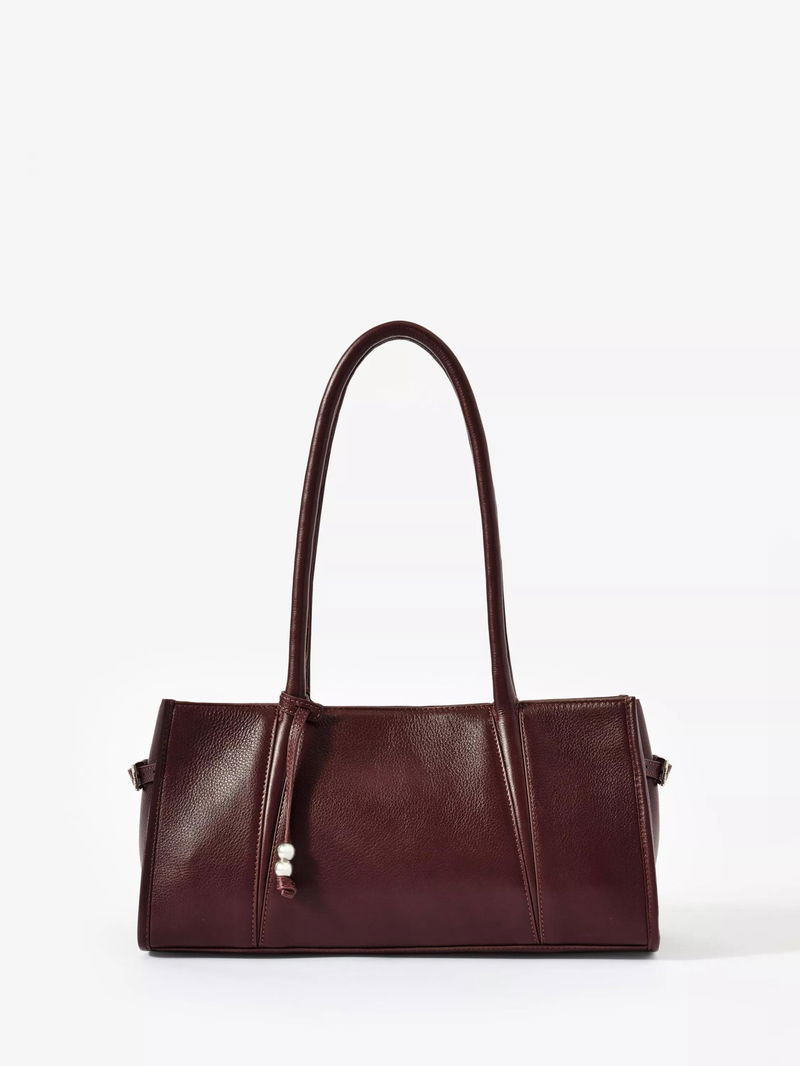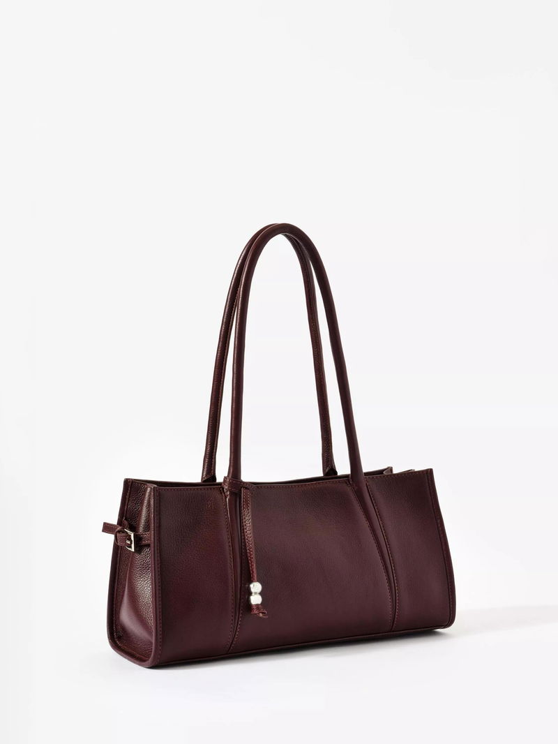 A leather rectangular bag featuring shoulder straps, metallic-tone buckle side detailing and hanging charm.