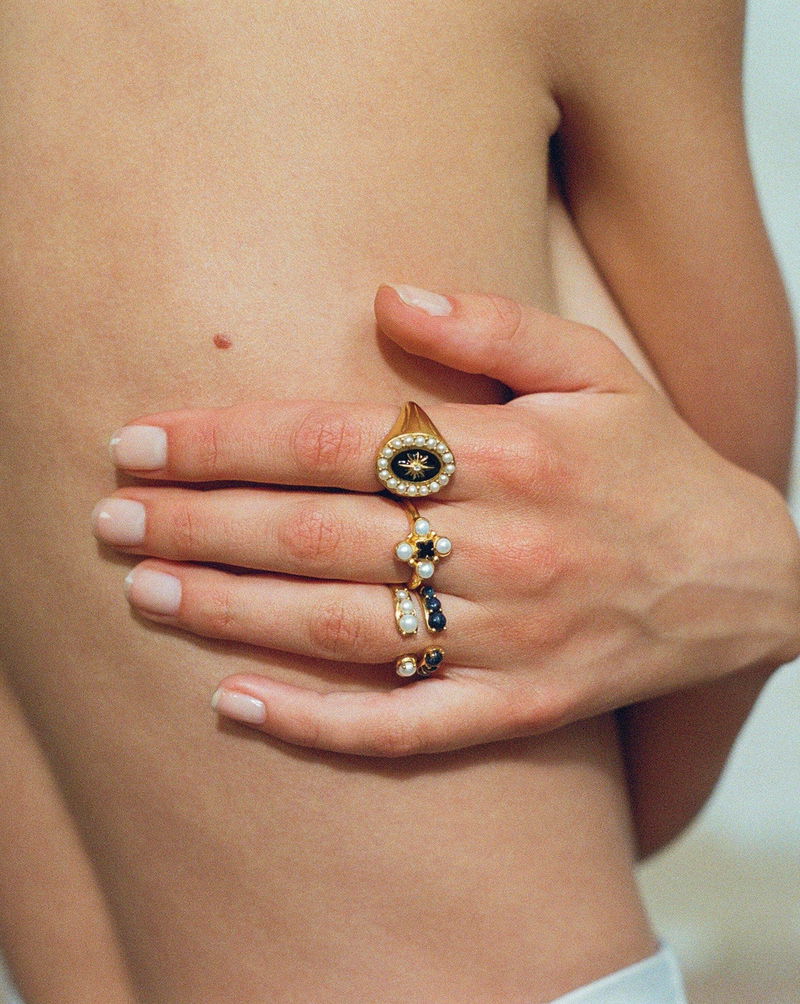 An ornate stacking ring with graduated white pearl prong set cabochons that lend a touch of opulence to the band. Wear this intricate style solo or stack it with other rings.Discover the world of Harris Reed x Missoma with jewellery for everyone, embracing your individuality, acceptance and being fabulously who you are.