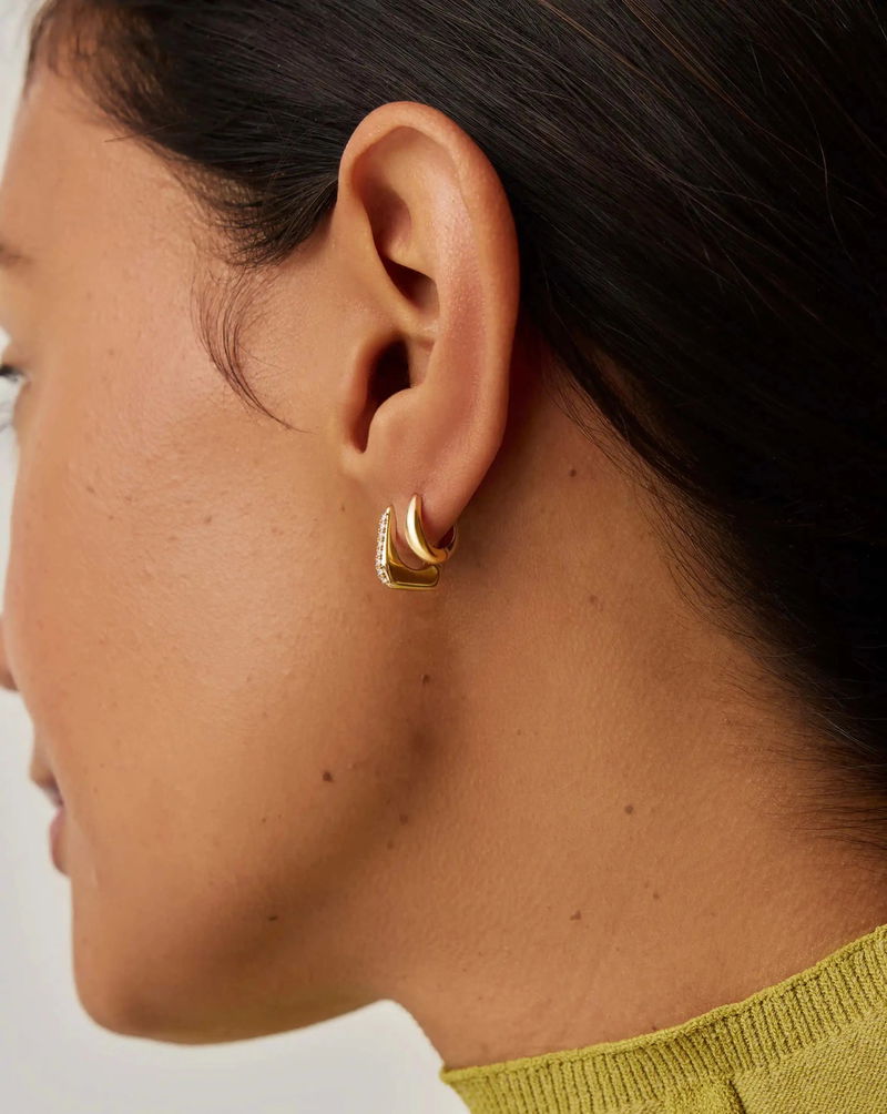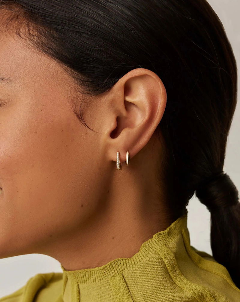 Celebrating ten years of the original jewellery collaboration with style icon Lucy Williams. A refined take on the iconic Lucy Williams Arco Hoops, these diamond huggies are crafted in 14ct solid gold embellished with a line of lab grown diamonds down the front. Wear solo or stack with our best selling hoops or huggies.