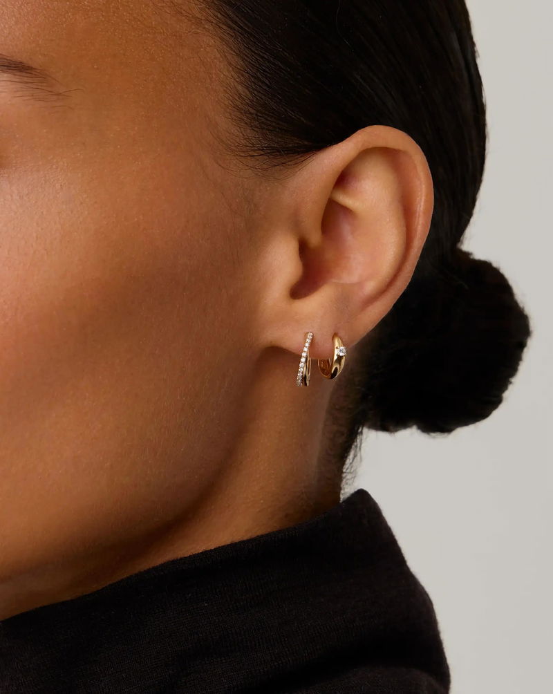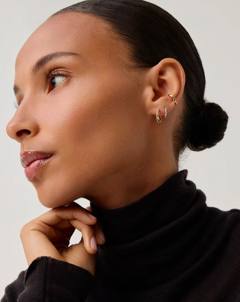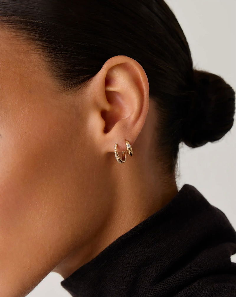 Celebrating ten years of the original jewellery collaboration with style icon Lucy Williams. An elevated take on a signature classic, these luxurious huggies are the evolution of our best selling Lucy Williams Entwine Small Hoops.