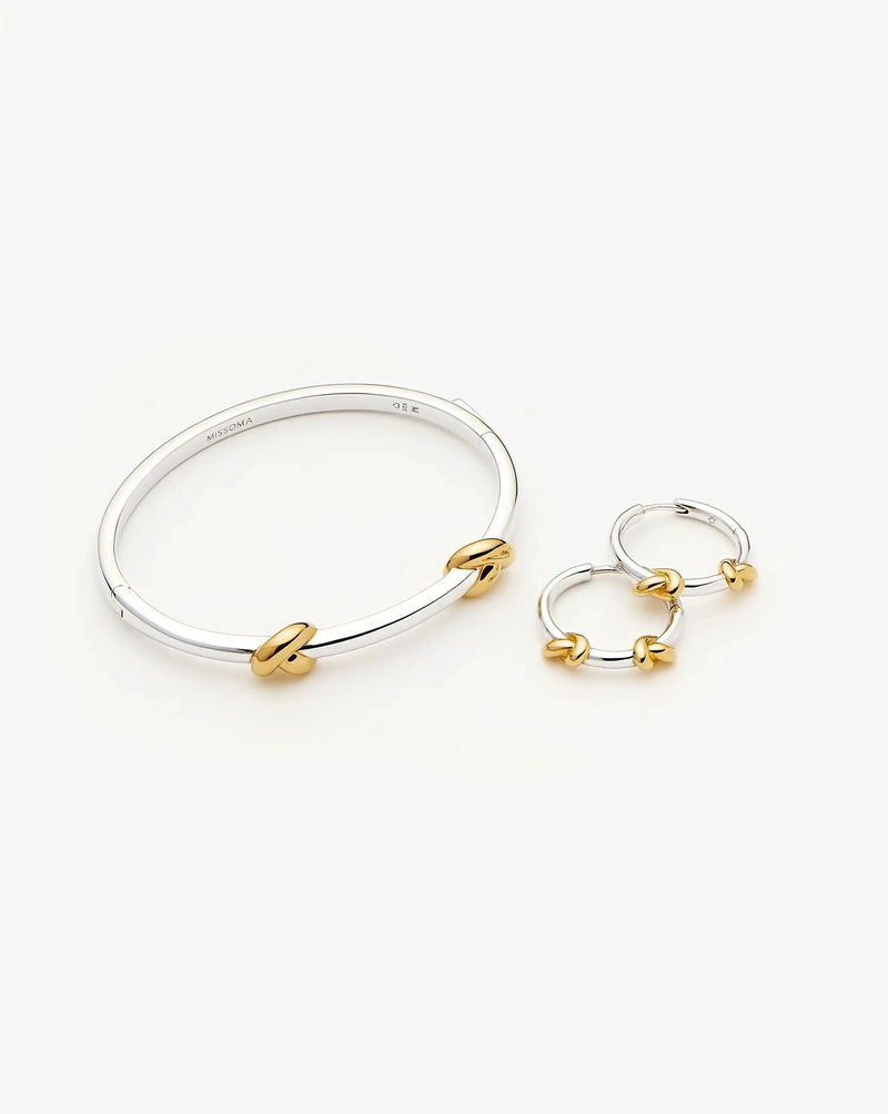 The ultimate Lucy Williams x Missoma set, the best selling Knot Bangle and Knot Small Hoop Earrings are paired together for an effortless mixed metals moment. Save when you buy together in a set. Lucy Williams Knot Hinged Bangle