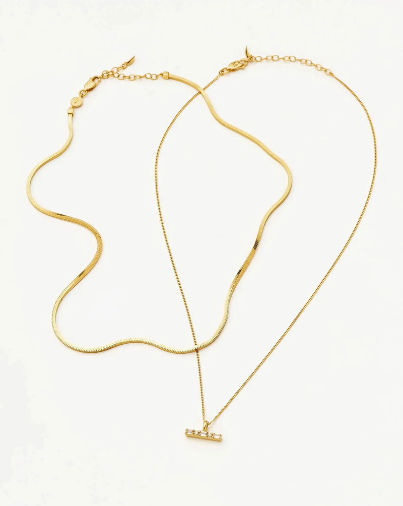 Upgrade your layers with this standout set. The Lucy Williams Square Snake Chain Necklace and T-Bar Stone Pendant Necklace create the ultimate duo.