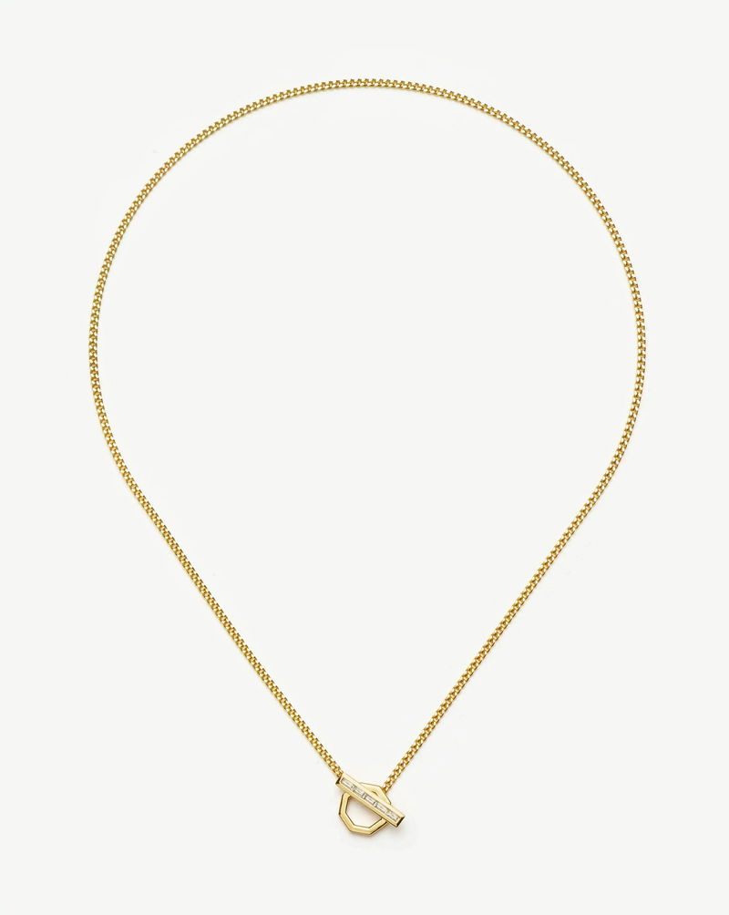 This pendant necklace features a stunning bar set with baguette cubic zirconia stones which links into a hexagonal ring. Wear solo or style with gold chains and hoop earrings.