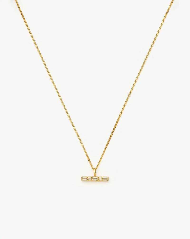 Celebrating ten years of the original jewellery collaboration with style icon Lucy Williams. An evolution of the signature favourite Lucy Williams T-bar design. This classic necklace features baguette and round cubic zirconia stones set into a small T-bar pendant. Wear solo or layer with chokers or longer chains.